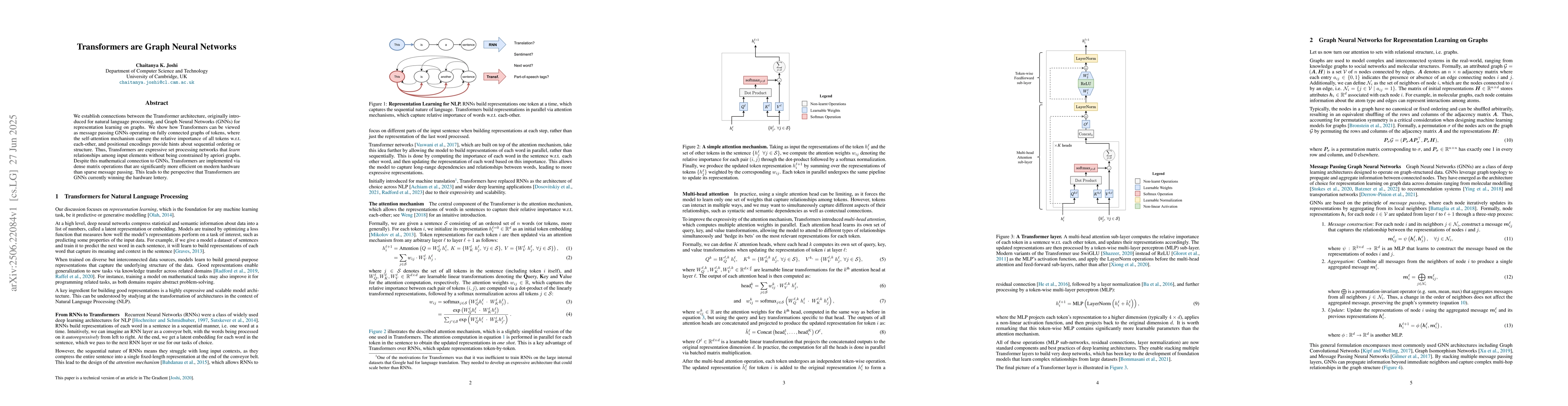 We establish connections between the Transformer architecture, originally introduced for natural language processing, and Graph Neural Networks (GNNs) for representation learning on graphs. We show how Transformers can be viewed as message passing GNNs operating on fully connected graphs of tokens, where the self-attention mechanism capture the relative importance of all tokens w.r.t. each-other, and positional encodings provide hints about sequential ordering or structure. Thus, Transformers are expressive set processing networks that learn relationships among input elements without being constrained by apriori graphs. Despite this mathematical connection to GNNs, Transformers are implemented via dense matrix operations that are significantly more efficient on modern hardware than sparse message passing. This leads to the perspective that Transformers are GNNs currently winning the hardware lottery.
