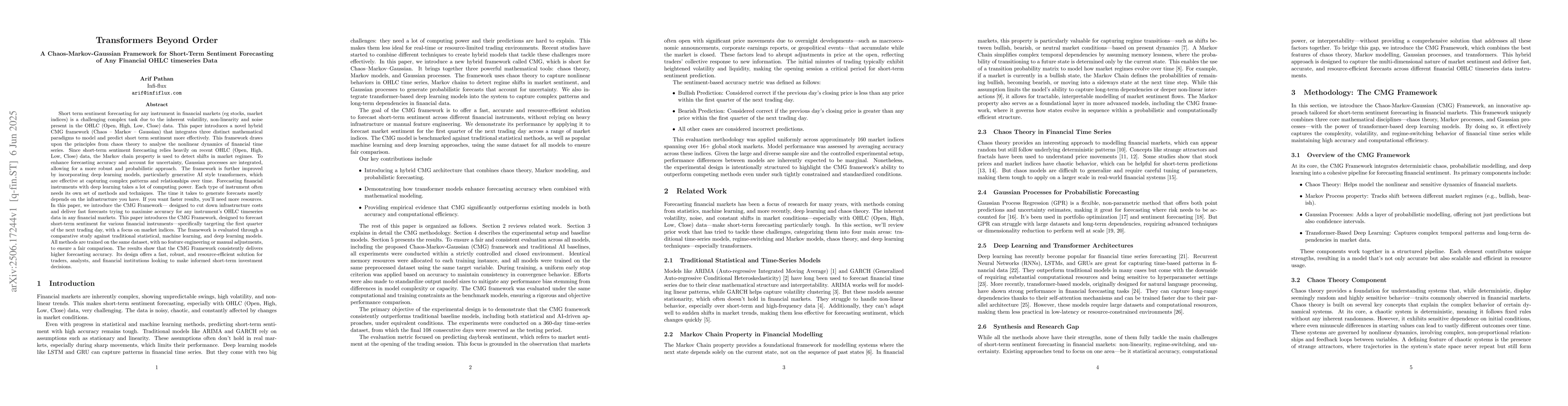 Short-term sentiment forecasting in financial markets (e.g., stocks, indices) is challenging due to volatility, non-linearity, and noise in OHLC (Open, High, Low, Close) data. This paper introduces a novel CMG (Chaos-Markov-Gaussian) framework that integrates chaos theory, Markov property, and Gaussian processes to improve prediction accuracy. Chaos theory captures nonlinear dynamics; the Markov chain models regime shifts; Gaussian processes add probabilistic reasoning. We enhance the framework with transformer-based deep learning models to capture temporal patterns efficiently. The CMG Framework is designed for fast, resource-efficient, and accurate forecasting of any financial instrument's OHLC time series. Unlike traditional models that require heavy infrastructure and instrument-specific tuning, CMG reduces overhead and generalizes well. We evaluate the framework on market indices, forecasting sentiment for the next trading day's first quarter. A comparative study against statistical, ML, and DL baselines trained on the same dataset with no feature engineering shows CMG consistently outperforms in accuracy and efficiency, making it valuable for analysts and financial institutions.