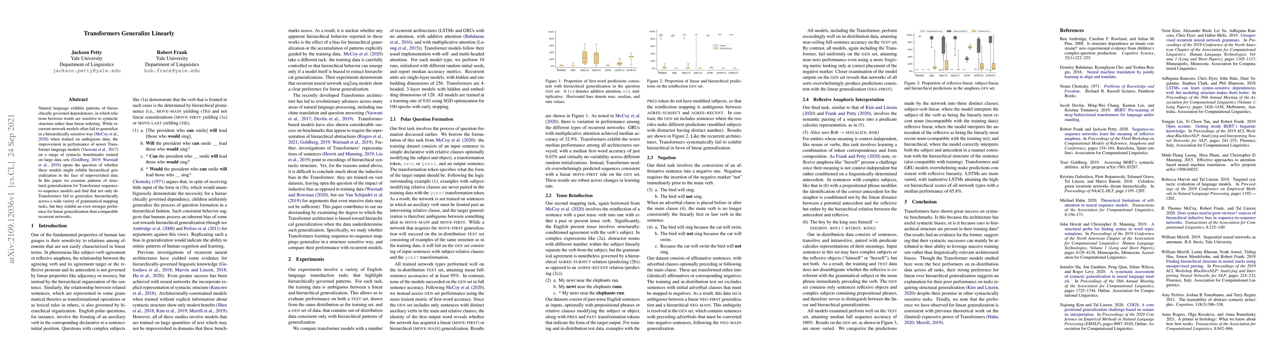 This paper investigates whether Transformer models generalize hierarchically in language tasks. It finds that, contrary to expectations, Transformers actually prefer linear generalization over hierarchical generalization, performing worse than recurrent networks on syntactic benchmarks.