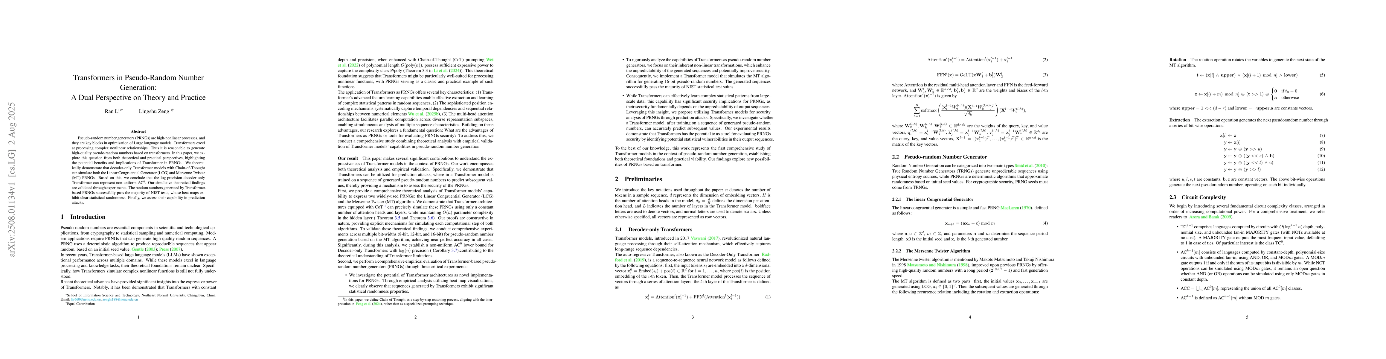 Pseudo-random number generators (PRNGs) are high-nonlinear processes, and they are key blocks in optimization of Large language models. Transformers excel at processing complex nonlinear relationships. Thus it is reasonable to generate high-quality pseudo-random numbers based on transformers. In this paper, we explore this question from both theoretical and practical perspectives, highlighting the potential benefits and implications of Transformer in PRNGs. We theoretically demonstrate that decoder-only Transformer models with Chain-of-Thought can simulate both the Linear Congruential Generator (LCG) and Mersenne Twister (MT) PRNGs. Based on this, we conclude that the log-precision decoder-only Transformer can represent non-uniform $\text{AC}^0$. Our simulative theoretical findings are validated through experiments. The random numbers generated by Transformer-based PRNGs successfully pass the majority of NIST tests, whose heat maps exhibit clear statistical randomness. Finally, we assess their capability in prediction attacks.