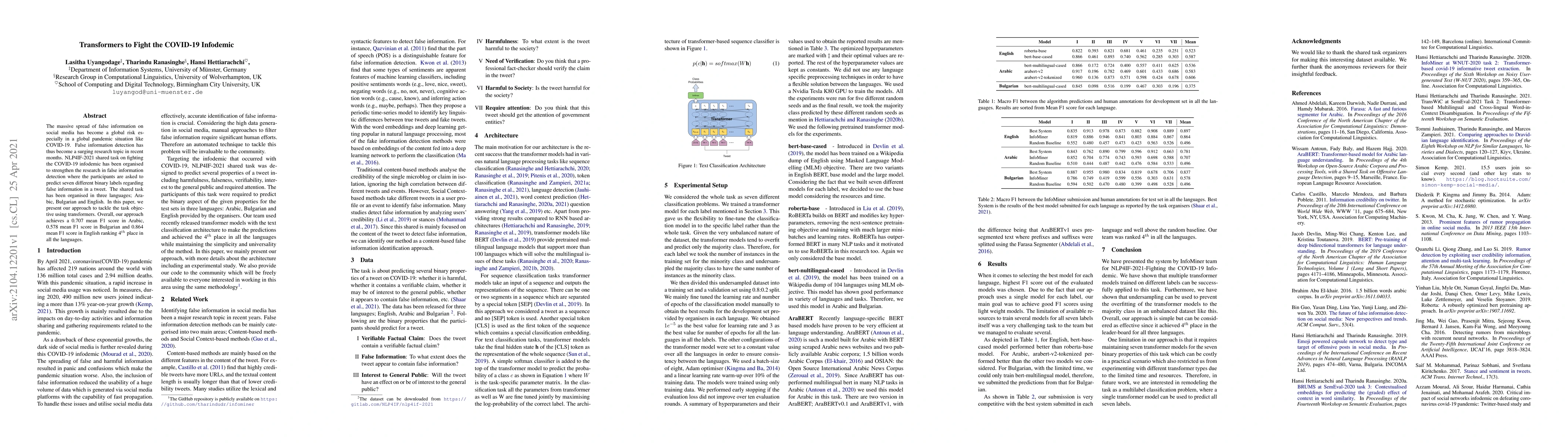 The massive spread of false information on social media has become a global risk especially in a global pandemic situation like COVID-19. False information detection has thus become a surging research topic in recent months. NLP4IF-2021 shared task on fighting the COVID-19 infodemic has been organised to strengthen the research in false information detection where the participants are asked to predict seven different binary labels regarding false information in a tweet. The shared task has been organised in three languages; Arabic, Bulgarian and English. In this paper, we present our approach to tackle the task objective using transformers. Overall, our approach achieves a 0.707 mean F1 score in Arabic, 0.578 mean F1 score in Bulgarian and 0.864 mean F1 score in English ranking 4th place in all the languages.