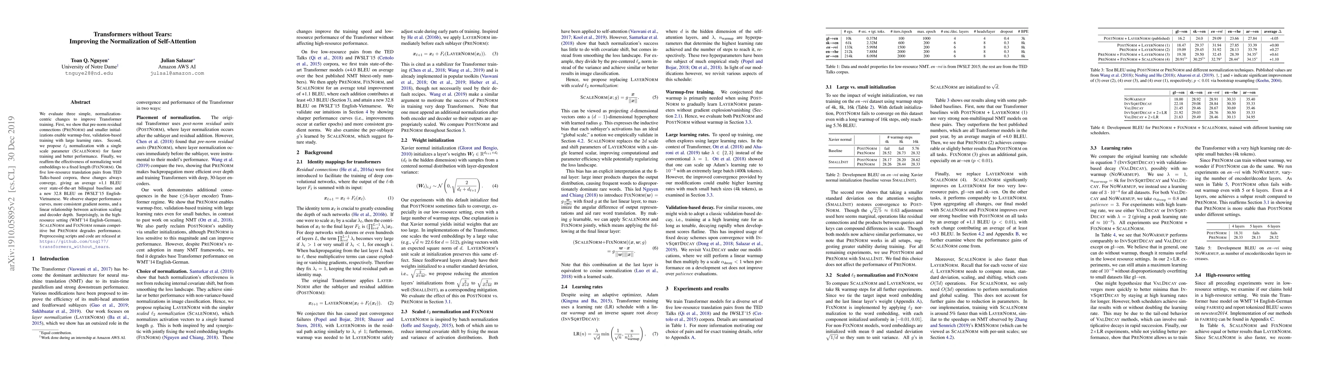This research paper proposes three normalization techniques for Transformers to improve training, achieving an average +1.1 BLEU score over state-of-the-art baselines with better performance curves.