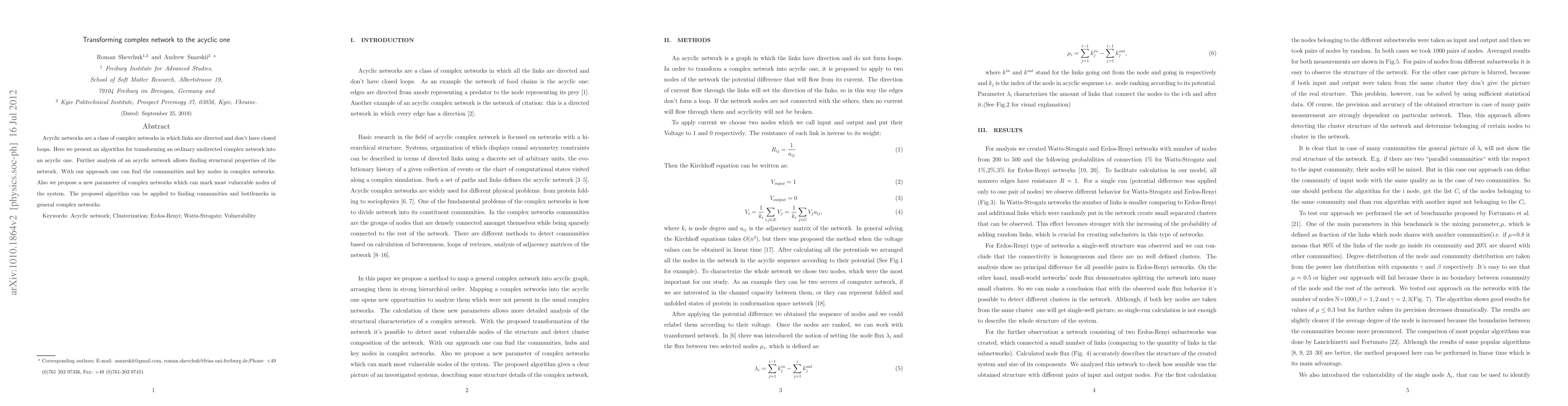 Acyclic networks are a class of complex networks in which links are directed and don't have closed loops. Here we present an algorithm for transforming an ordinary undirected complex network into an acyclic one. Further analysis of an acyclic network allows finding structural properties of the network. With our approach one can find the communities and key nodes in complex networks. Also we propose a new parameter of complex networks which can mark most vulnerable nodes of the system. The proposed algorithm can be applied to finding communities and bottlenecks in general complex networks.