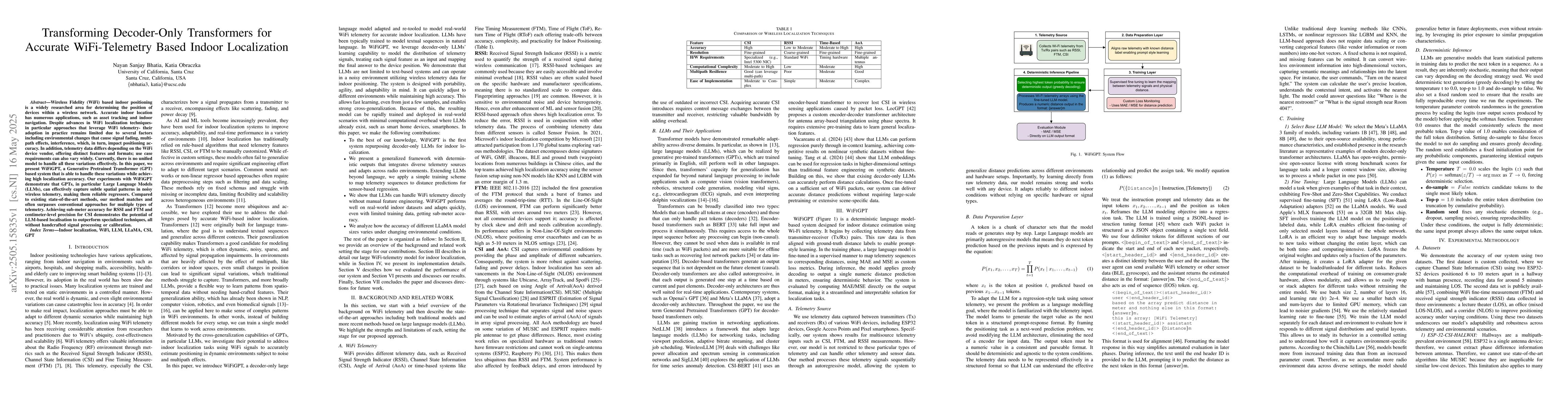 The research introduces WiFiGPT, a Generative Pretrained Transformer (GPT) based system designed to handle variations in WiFi telemetry data for accurate indoor localization, employing Large Language Models (LLMs) to capture subtle spatial patterns in noisy wireless telemetry data.