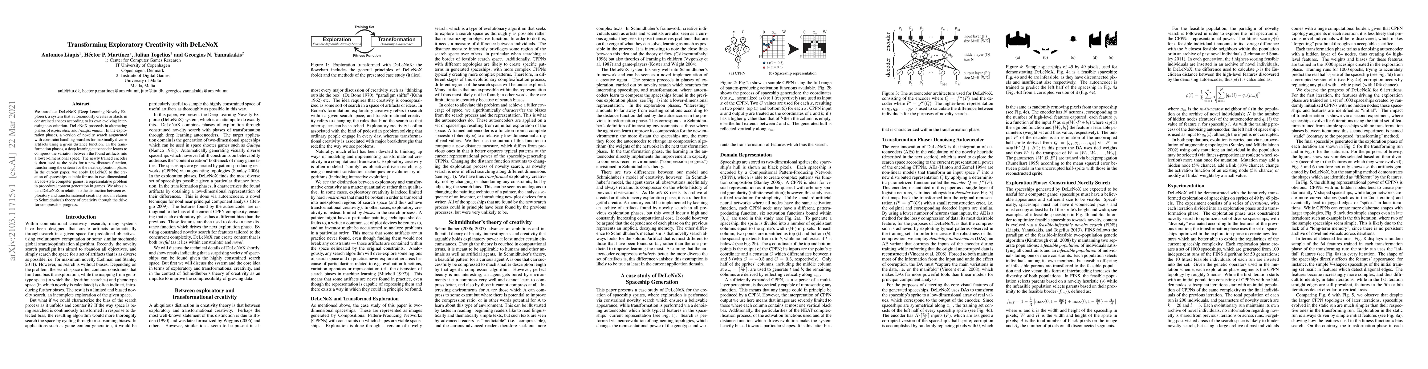 We introduce DeLeNoX (Deep Learning Novelty Explorer), a system that autonomously creates artifacts in constrained spaces according to its own evolving interestingness criterion. DeLeNoX proceeds in alternating phases of exploration and transformation. In the exploration phases, a version of novelty search augmented with constraint handling searches for maximally diverse artifacts using a given distance function. In the transformation phases, a deep learning autoencoder learns to compress the variation between the found artifacts into a lower-dimensional space. The newly trained encoder is then used as the basis for a new distance function, transforming the criteria for the next exploration phase. In the current paper, we apply DeLeNoX to the creation of spaceships suitable for use in two-dimensional arcade-style computer games, a representative problem in procedural content generation in games. We also situate DeLeNoX in relation to the distinction between exploratory and transformational creativity, and in relation to Schmidhuber's theory of creativity through the drive for compression progress.