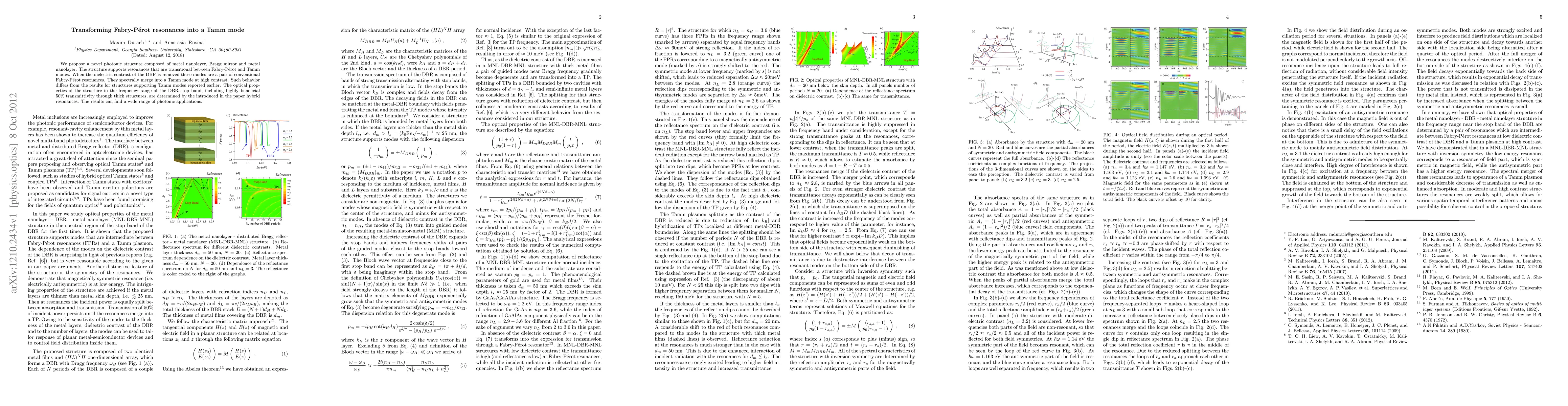 This paper introduces a novel photonic structure combining metal nanolayers and a Bragg mirror, which supports hybrid resonances transitioning between Fabry-Perot and Tamm modes. The structure exhibits high transmittivity and unique optical properties within the DBR stop band, potentially enabling diverse photonic applications.