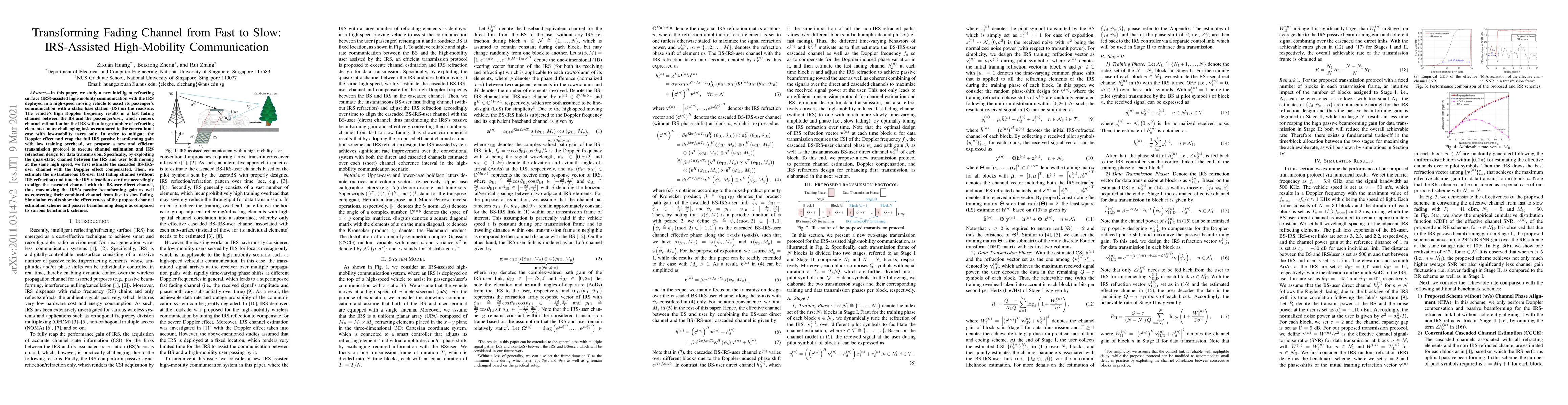 This paper proposes a new IRS-assisted communication protocol for high-mobility scenarios where an IRS on a fast-moving vehicle aids in communication with a static base station. The protocol efficiently estimates and compensates for the Doppler effect to convert the fast fading channel into a slow fading channel, maximizing IRS passive beamforming gain with minimal training overhead.
