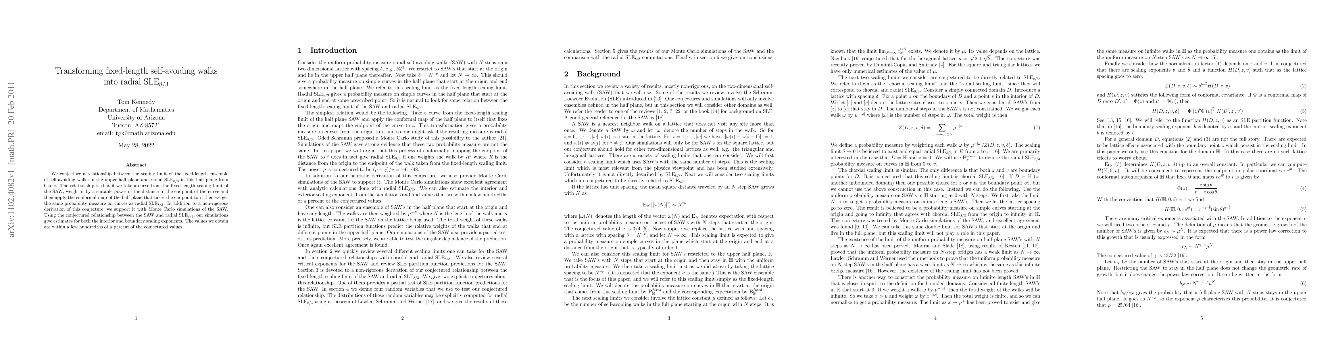 We conjecture a relationship between the scaling limit of the fixed-length ensemble of self-avoiding walks in the upper half plane and radial SLE with kappa=8/3 in this half plane from 0 to i. The relationship is that if we take a curve from the fixed-length scaling limit of the SAW, weight it by a suitable power of the distance to the endpoint of the curve and then apply the conformal map of the half plane that takes the endpoint to i, then we get the same probability measure on curves as radial SLE. In addition to a non-rigorous derivation of this conjecture, we support it with Monte Carlo simulations of the SAW. Using the conjectured relationship between the SAW and radial SLE, our simulations give estimates for both the interior and boundary scaling exponents. The values we obtain are within a few hundredths of a percent of the conjectured values.
