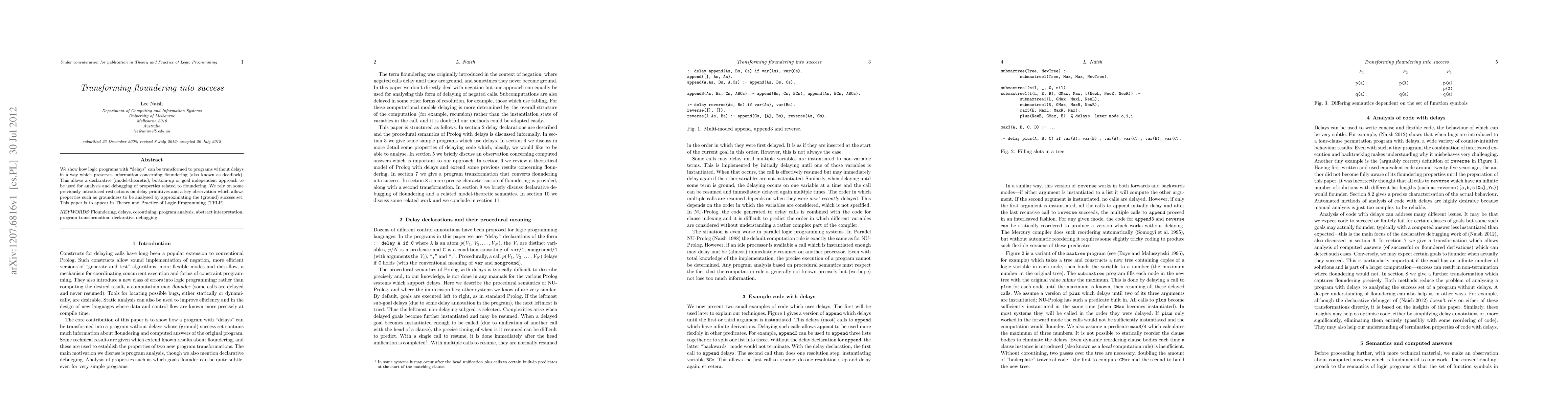 We show how logic programs with "delays" can be transformed to programs without delays in a way which preserves information concerning floundering (also known as deadlock). This allows a declarative (model-theoretic), bottom-up or goal independent approach to be used for analysis and debugging of properties related to floundering. We rely on some previously introduced restrictions on delay primitives and a key observation which allows properties such as groundness to be analysed by approximating the (ground) success set. This paper is to appear in Theory and Practice of Logic Programming (TPLP). Keywords: Floundering, delays, coroutining, program analysis, abstract interpretation, program transformation, declarative debugging