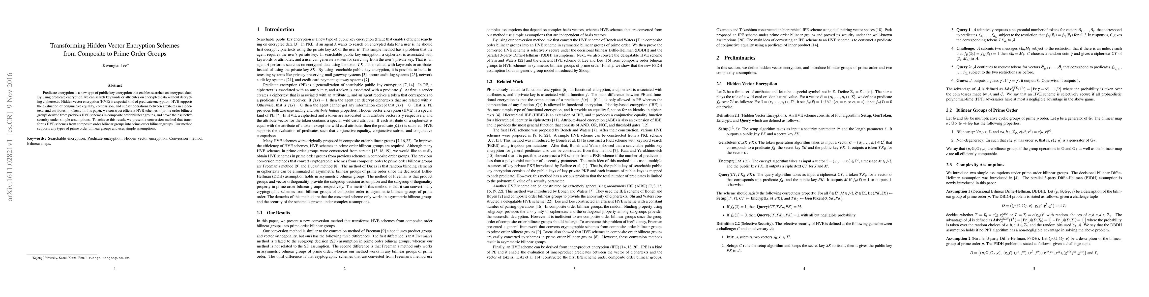 This paper transforms Hidden Vector Encryption schemes from composite to prime order groups, enabling more efficient and secure searches on encrypted data. The transformation method is simple and supports any type of prime order bilinear group.