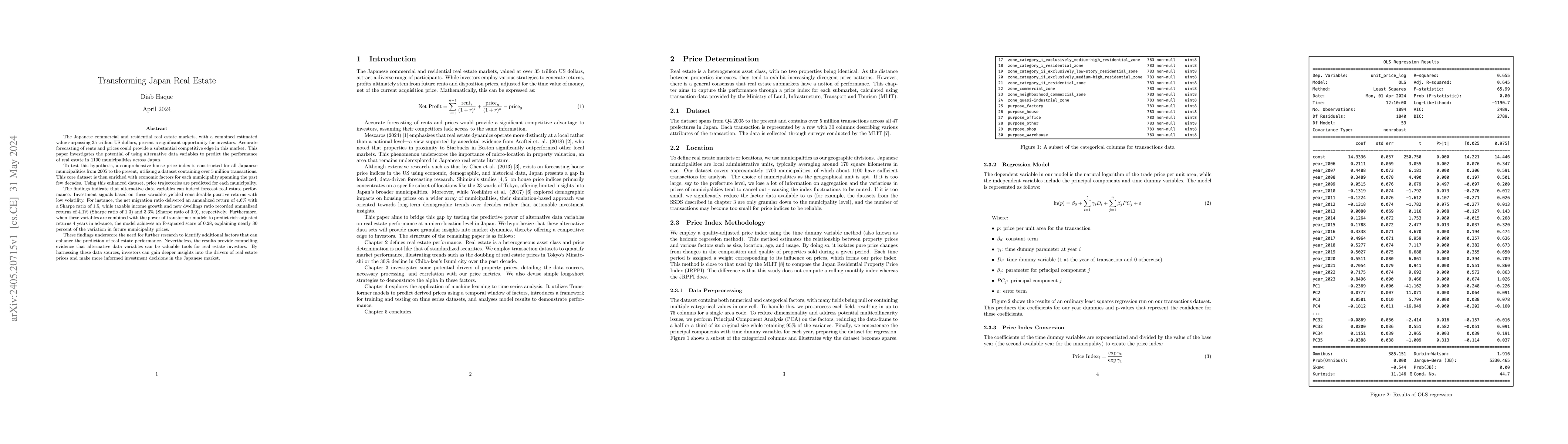 This paper investigates the use of alternative data variables to forecast Japanese real estate performance across 1100 municipalities. The study found that incorporating factors like net migration ratio, taxable income growth, and new dwellings ratio, alongside transformer models, effectively predicts future prices with notable returns and low volatility.