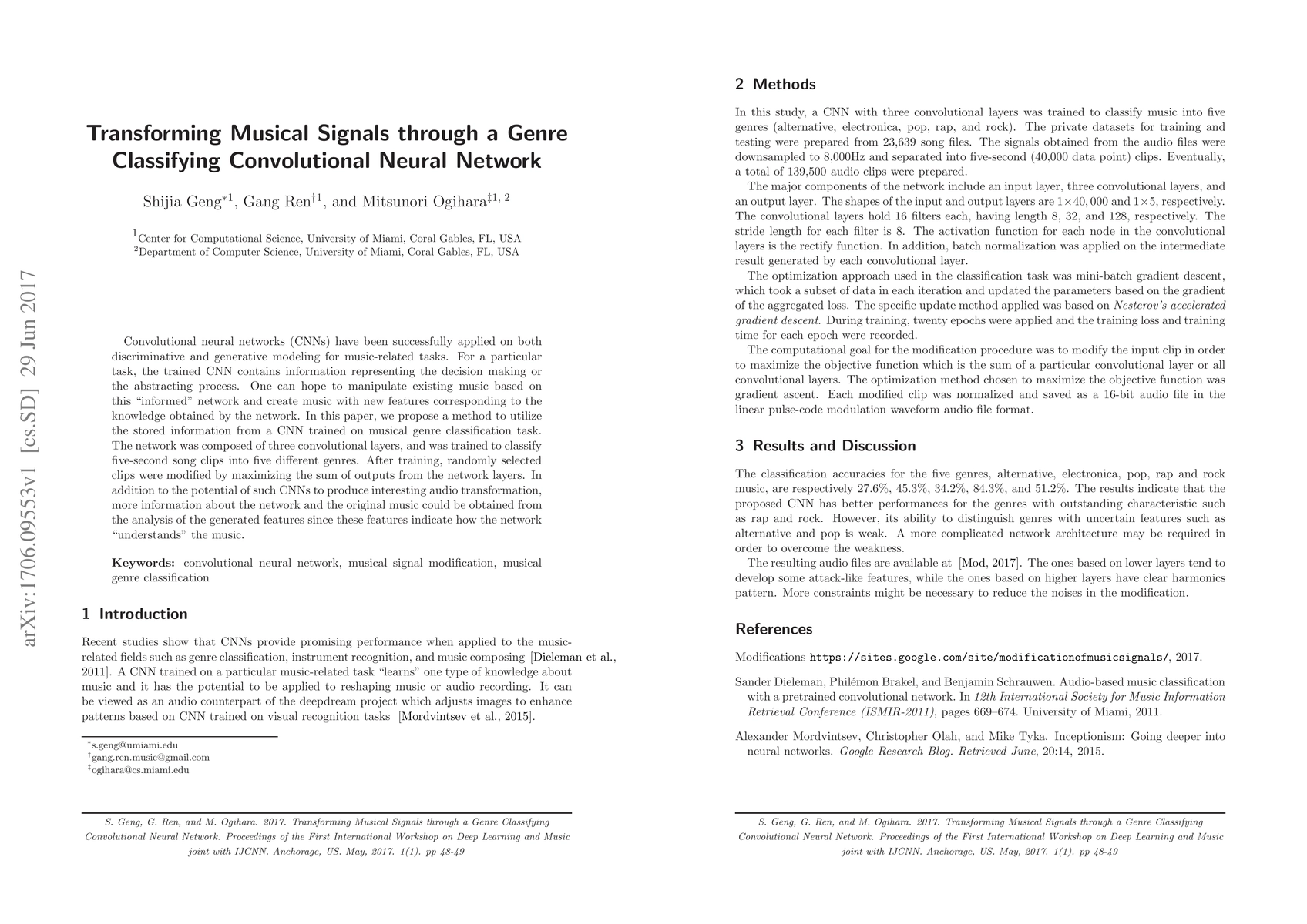Convolutional neural networks (CNNs) have been successfully applied on both discriminative and generative modeling for music-related tasks. For a particular task, the trained CNN contains information representing the decision making or the abstracting process. One can hope to manipulate existing music based on this 'informed' network and create music with new features corresponding to the knowledge obtained by the network. In this paper, we propose a method to utilize the stored information from a CNN trained on musical genre classification task. The network was composed of three convolutional layers, and was trained to classify five-second song clips into five different genres. After training, randomly selected clips were modified by maximizing the sum of outputs from the network layers. In addition to the potential of such CNNs to produce interesting audio transformation, more information about the network and the original music could be obtained from the analysis of the generated features since these features indicate how the network 'understands' the music.
