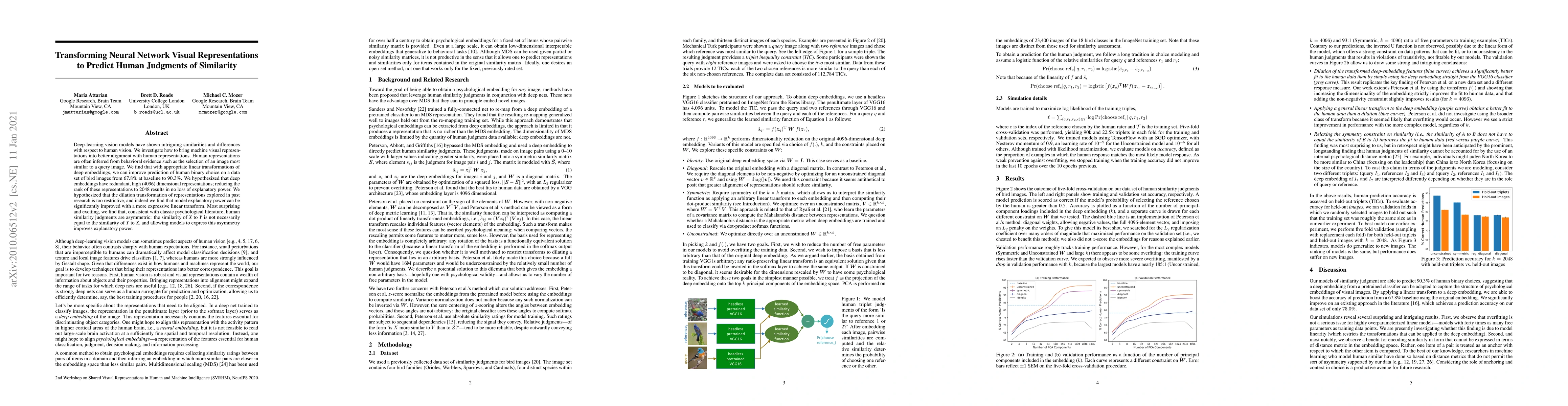 Deep-learning vision models have shown intriguing similarities and differences with respect to human vision. We investigate how to bring machine visual representations into better alignment with human representations. Human representations are often inferred from behavioral evidence such as the selection of an image most similar to a query image. We find that with appropriate linear transformations of deep embeddings, we can improve prediction of human binary choice on a data set of bird images from 72% at baseline to 89%. We hypothesized that deep embeddings have redundant, high (4096) dimensional representations; however, reducing the rank of these representations results in a loss of explanatory power. We hypothesized that the dilation transformation of representations explored in past research is too restrictive, and indeed we found that model explanatory power can be significantly improved with a more expressive linear transform. Most surprising and exciting, we found that, consistent with classic psychological literature, human similarity judgments are asymmetric: the similarity of X to Y is not necessarily equal to the similarity of Y to X, and allowing models to express this asymmetry improves explanatory power.
