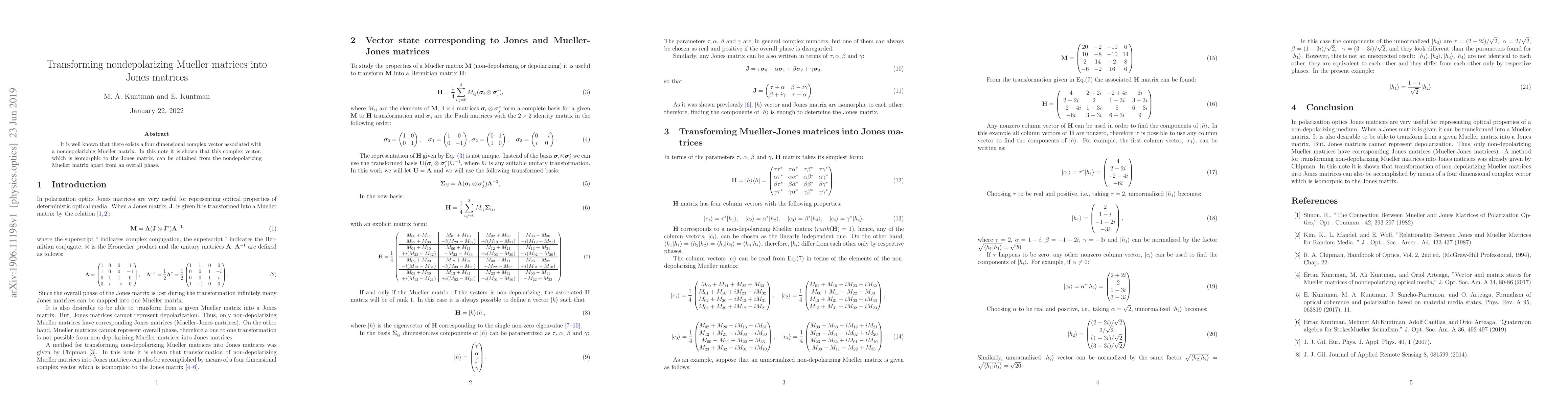 This paper demonstrates how to derive a four-dimensional complex vector, isomorphic to the Jones matrix, from a nondepolarizing Mueller matrix, with the transformation being valid up to an overall phase.