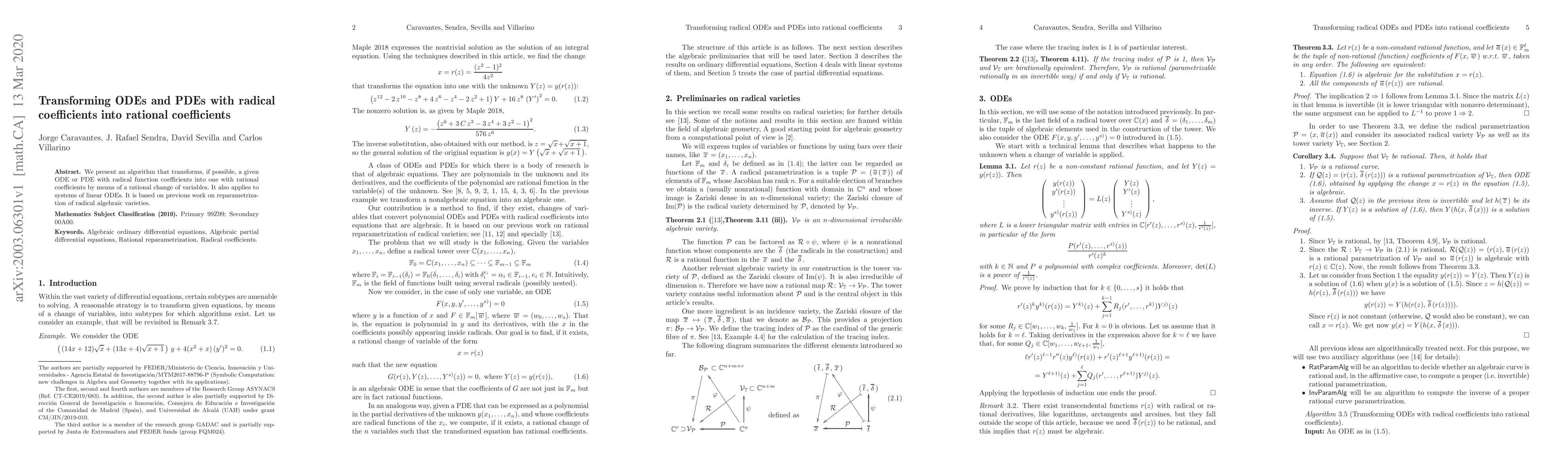 We present an algorithm that transforms, if possible, a given ODE or PDE with radical function coefficients into one with rational coefficients by means of a rational change of variables. It also applies to systems of linear ODEs. It is based on previous work on reparametrization of radical algebraic varieties.