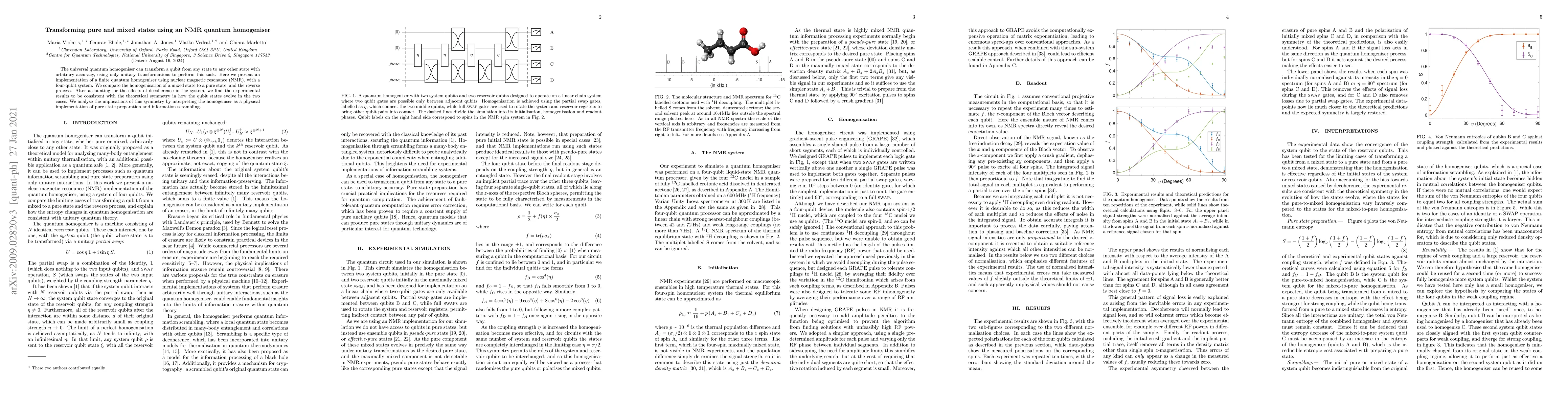 This paper presents an NMR implementation of a finite quantum homogeniser that transforms qubits between pure and mixed states with high accuracy, demonstrating symmetry in the evolution of these states despite decoherence. The study interprets the homogeniser as a method for pure state preparation and information scrambling.
