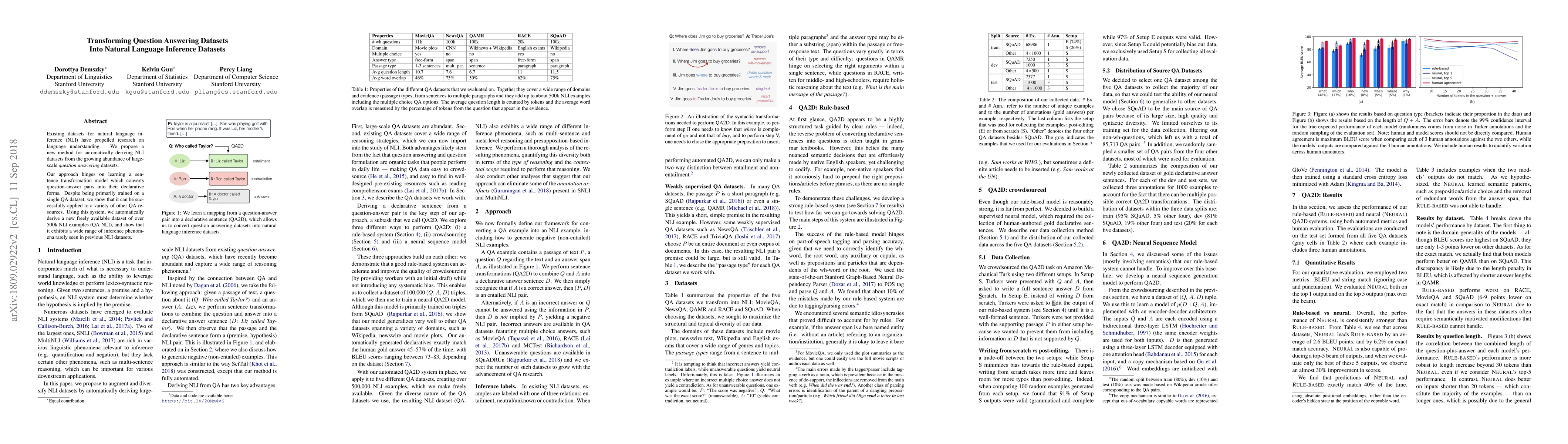 This paper proposes a method to automatically generate natural language inference (NLI) datasets from existing question-answering (QA) datasets by transforming question-answer pairs into declarative sentences. The derived QA-NLI dataset contains over 500k examples and demonstrates a variety of inference phenomena not typically found in previous NLI datasets.
