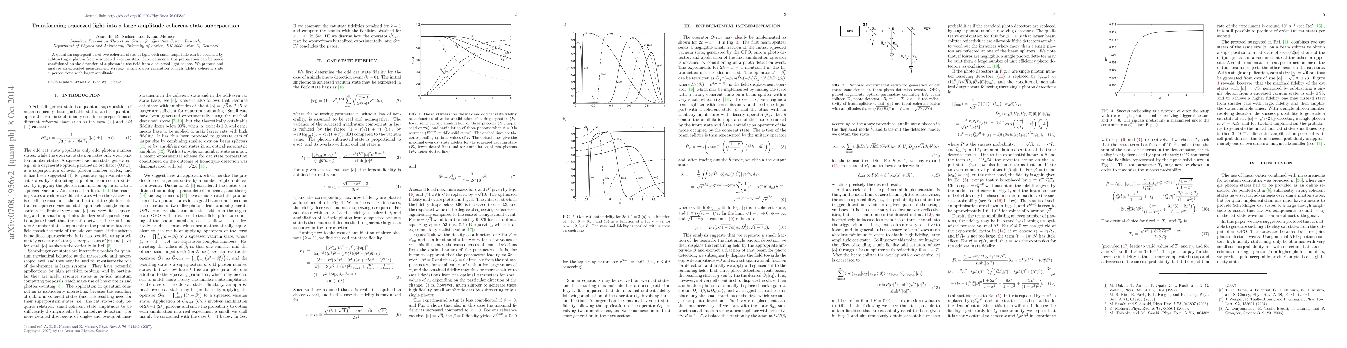 The research proposes a method to transform squeezed light into a high amplitude coherent state superposition by subtracting a photon from a squeezed vacuum state, conditioned on detecting a photon from a squeezed light source, and introduces an extended measurement strategy for generating more faithful large amplitude coherent state superpositions.