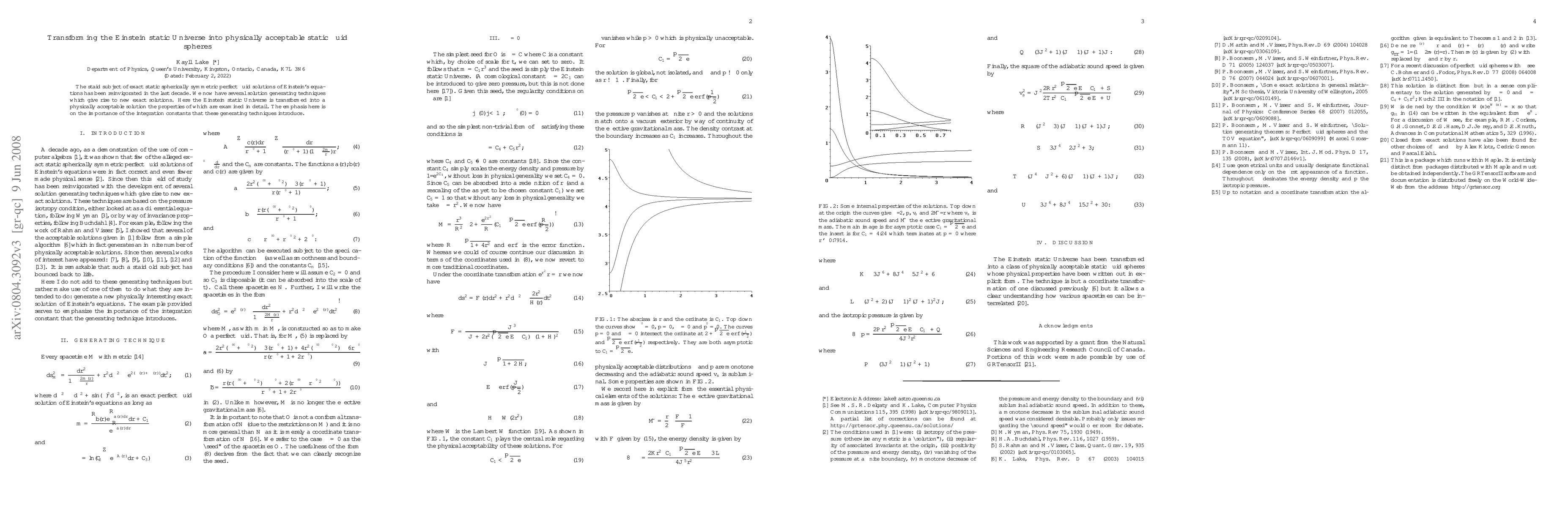 The staid subject of exact static spherically symmetric perfect fluid solutions of Einstein's equations has been reinvigorated in the last decade. We now have several solution generating techniques which give rise to new exact solutions. Here the Einstein static Universe is transformed into a physically acceptable solution the properties of which are examined in detail. The emphasis here is on the importance of the integration constants that these generating techniques introduce.