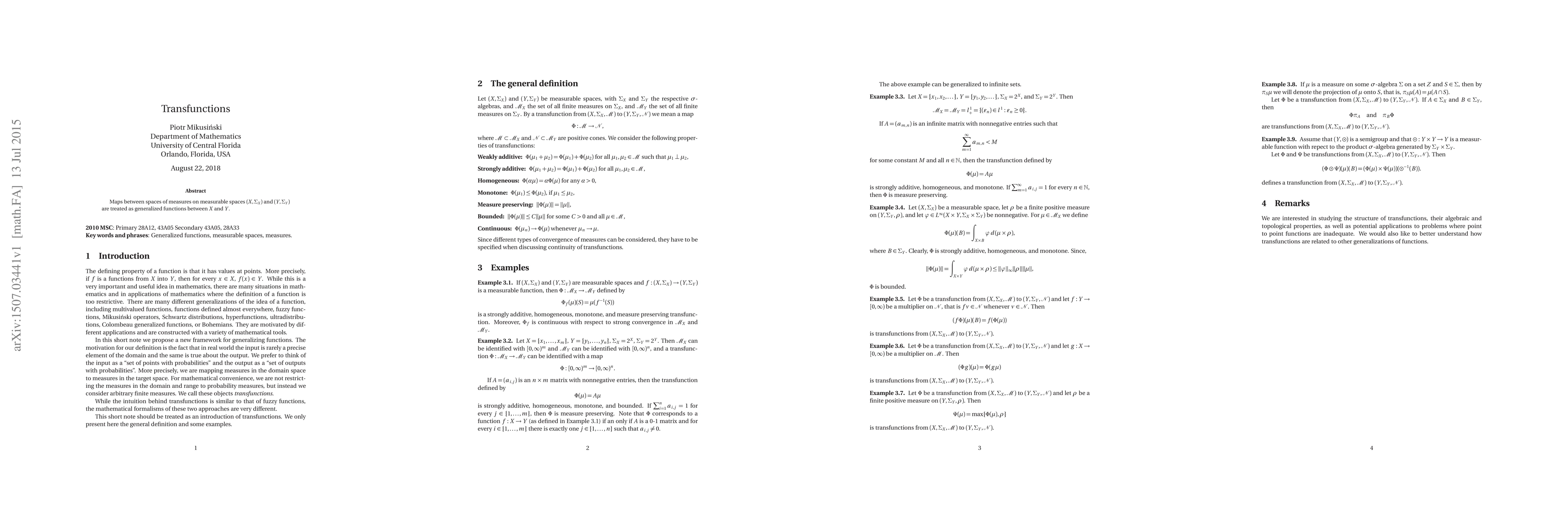 Maps between spaces of measures on measurable spaces $(X,\Sigma_X)$ and $(Y, \Sigma_Y)$ are treated as generalized functions between $X$ and $Y$.