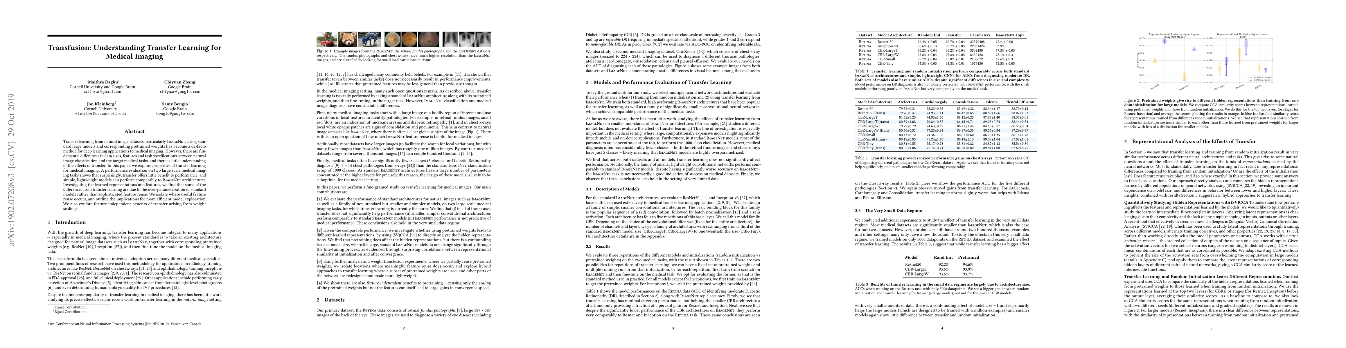 This paper investigates transfer learning for medical imaging, finding that despite its success in natural image classification, it offers little performance improvement for medical tasks. Simple, lightweight models often perform as well as complex ImageNet-pretrained models, suggesting that over-parametrization may hinder effective feature reuse.
