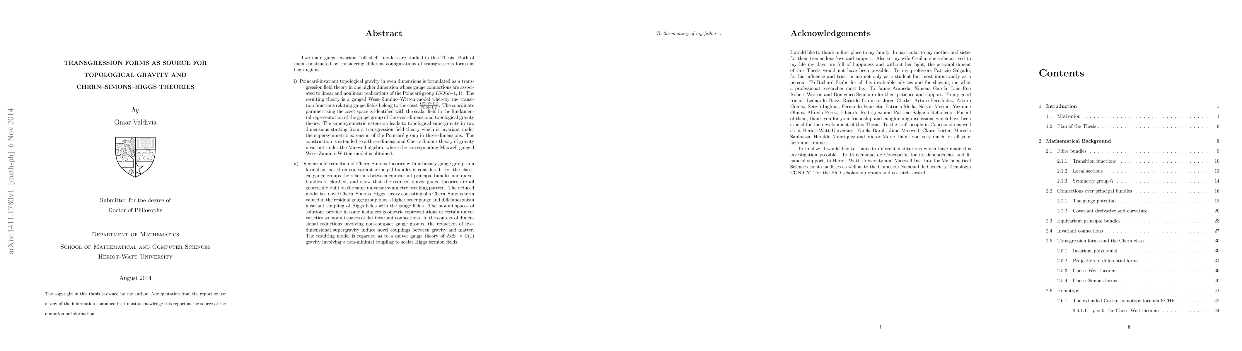 This research paper investigates two off-shell gauge invariant models: topological gravity formulated as a transgression field theory and the dimensional reduction of Chern-Simons theories. It constructs topological supergravity and novel Chern-Simons-Higgs theories, revealing universal symmetry breaking patterns and new couplings between gravity and matter.