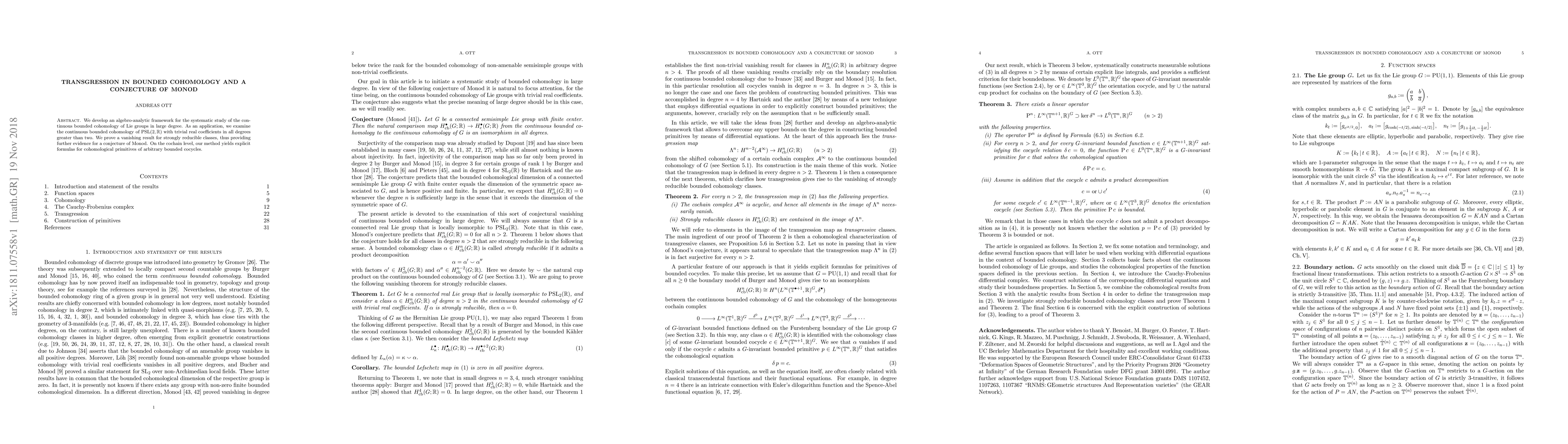 This paper introduces a new framework for studying the continuous bounded cohomology of Lie groups, specifically focusing on PSL(2,R). The authors prove a vanishing result for strongly reducible classes in high degrees, supporting Monod's conjecture, and provide explicit formulas for cohomological primitives of bounded cocycles.