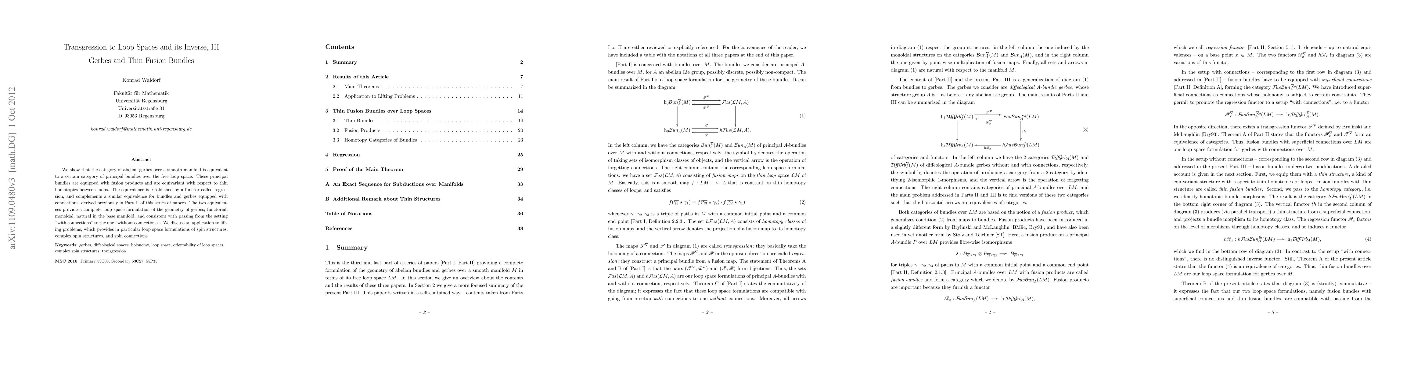 We show that the category of abelian gerbes over a smooth manifold is equivalent to a certain category of principal bundles over the free loop space. These principal bundles are equipped with fusion products and are equivariant with respect to thin homotopies between loops. The equivalence is established by a functor called regression, and complements a similar equivalence for bundles and gerbes equipped with connections, derived previously in Part II of this series of papers. The two equivalences provide a complete loop space formulation of the geometry of gerbes; functorial, monoidal, natural in the base manifold, and consistent with passing from the setting "with connections" to the one "without connections". We discuss an application to lifting problems, which provides in particular loop space formulations of spin structures, complex spin structures, and spin connections.