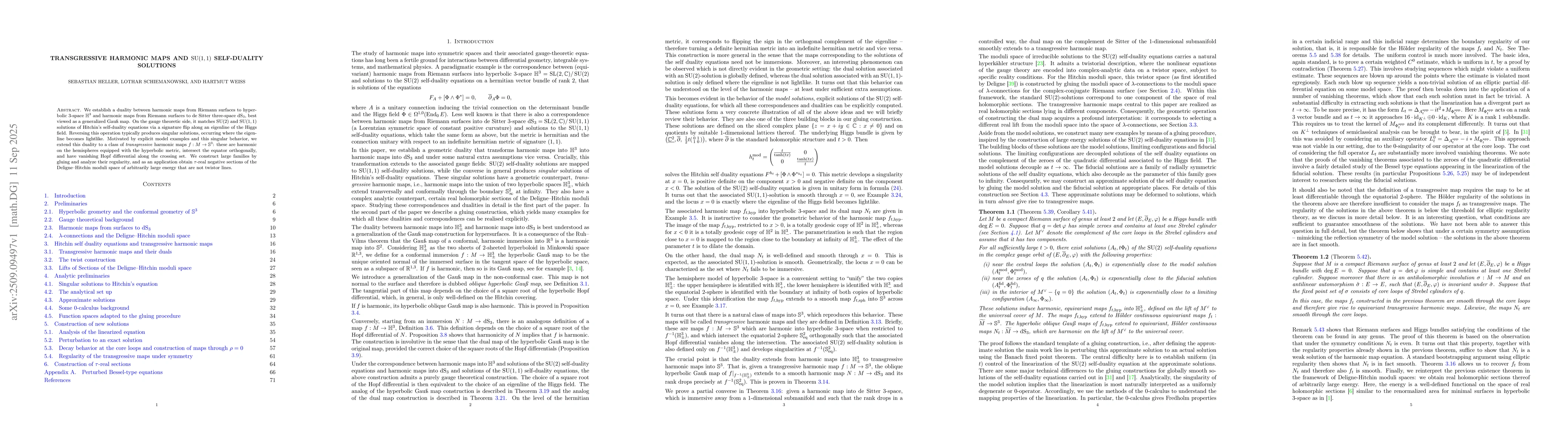 We establish a duality between harmonic maps from Riemann surfaces to hyperbolic 3-space $\mathbb{H}^3$ and harmonic maps from Riemann surfaces to de Sitter three-space $\operatorname{dS}_3$, best viewed as a generalized Gauss map. On the gauge theoretic side, it matches SU(2) and SU(1,1) solutions of Hitchin's self-duality equations via a signature flip along an eigenline of the Higgs field. Reversing this operation typically produces singular solutions, occurring where the eigenline becomes lightlike. Motivated by explicit model examples and this singular behavior, we extend this duality to a class of transgressive harmonic maps $f:M\to \mathbb{S}^3$: these are harmonic on the hemispheres equipped with the hyperbolic metric, intersect the equator orthogonally, and have vanishing Hopf differential along the crossing set. We construct large families by gluing and analyze their regularity, and as an application obtain $\tau$-real negative sections of the Deligne--Hitchin moduli space of arbitrarily large energy that are not twistor lines.