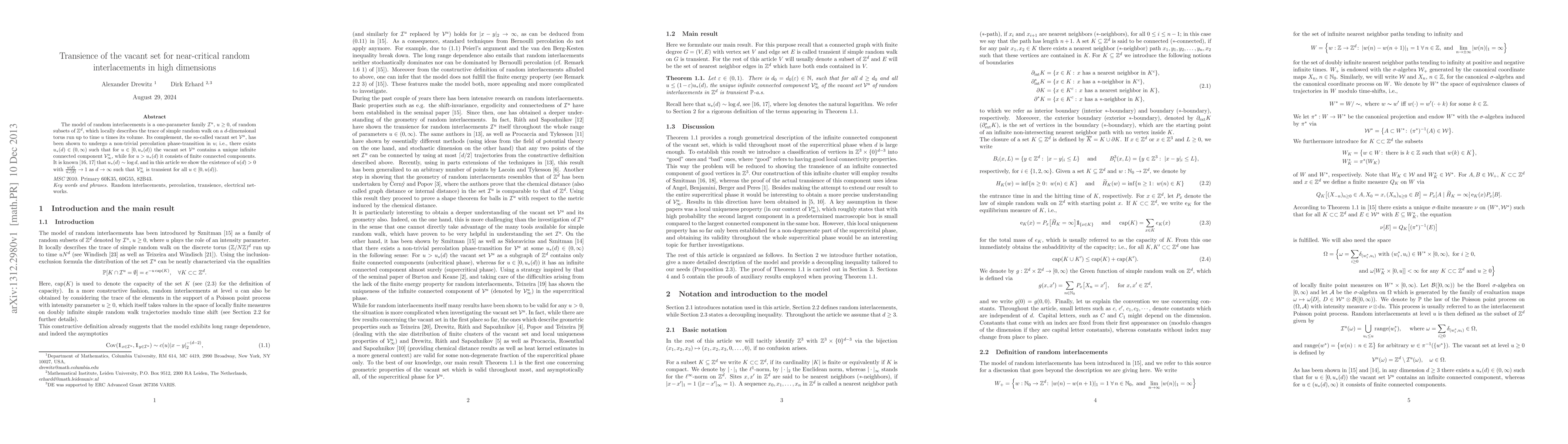The model of random interlacements is a one-parameter family $\mathcal I^u,$ $u \ge 0,$ of random subsets of $\mathbb{Z}^d,$ which locally describes the trace of simple random walk on a $d$-dimensional torus run up to time $u$ times its volume. Its complement, the so-called vacant set $\mathcal V^u$, has been shown to undergo a non-trivial percolation phase-transition in $u;$ i.e., there exists $u_*(d) \in (0, \infty)$ such that for $u \in [0, u_*(d))$ the vacant set $\mathcal V^u$ contains a unique infinite connected component $\mathcal V_\infty^u,$ while for $u > u_*(d)$ it consists of finite connected components. Sznitman \cite{SZ11,SZ11B} showed that $u_*(d) \sim \log d,$ and in this article we show the existence of $u(d) > 0$ with $\frac{u(d)}{u_*(d)} \to 1$ as $d \to \infty$ such that $\mathcal V_\infty^{u}$ is transient for all $u \in [0, u(d)).$