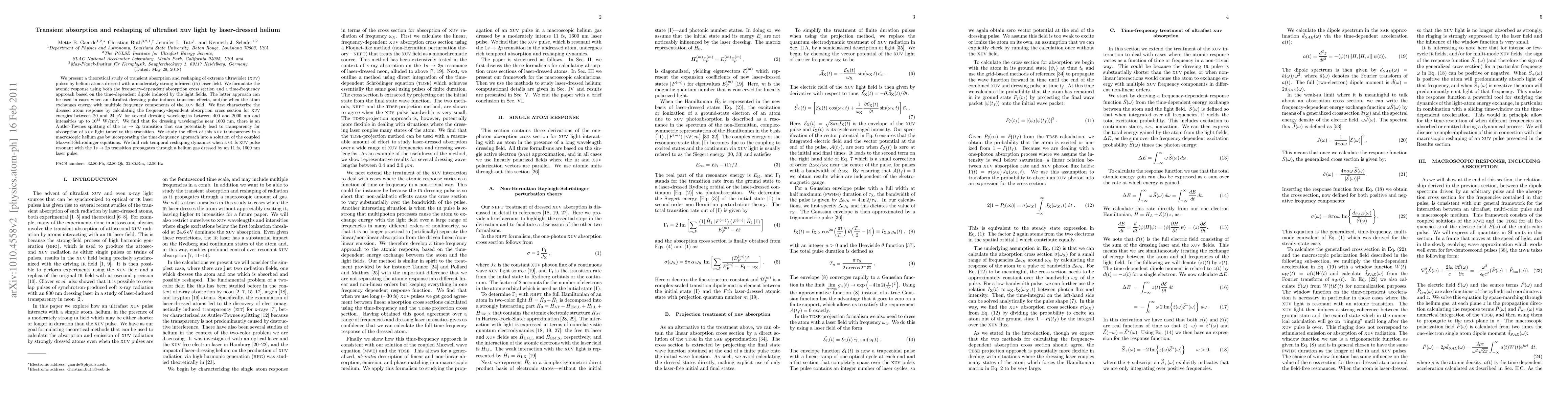 This paper investigates how infrared laser fields influence the transient absorption and reshaping of ultrafast XUV pulses by helium atoms, using theoretical models to describe the frequency-dependent absorption and time-frequency dynamics. It reveals that specific infrared dressing wavelengths can induce transparency for certain XUV energies and leads to complex temporal reshaping effects in helium gas.