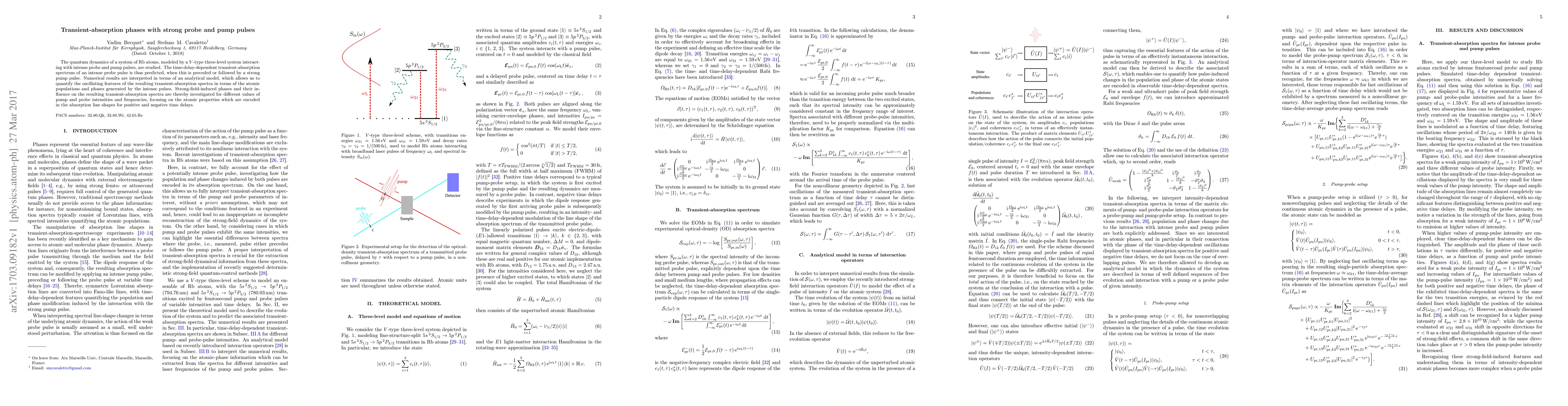 The research investigates the interaction of Rb atoms, modeled as a V-type three-level system, with intense probe and pump pulses in a transient-absorption spectroscopy setup. Numerical simulations are used to generate time-delay- and pulse-intensity-dependent spectra, which are then interpreted using an analytical model to connect time-delay-dependent oscillations in the spectra with pump- and probe-pulse-induced quantum phases of the atomic system.