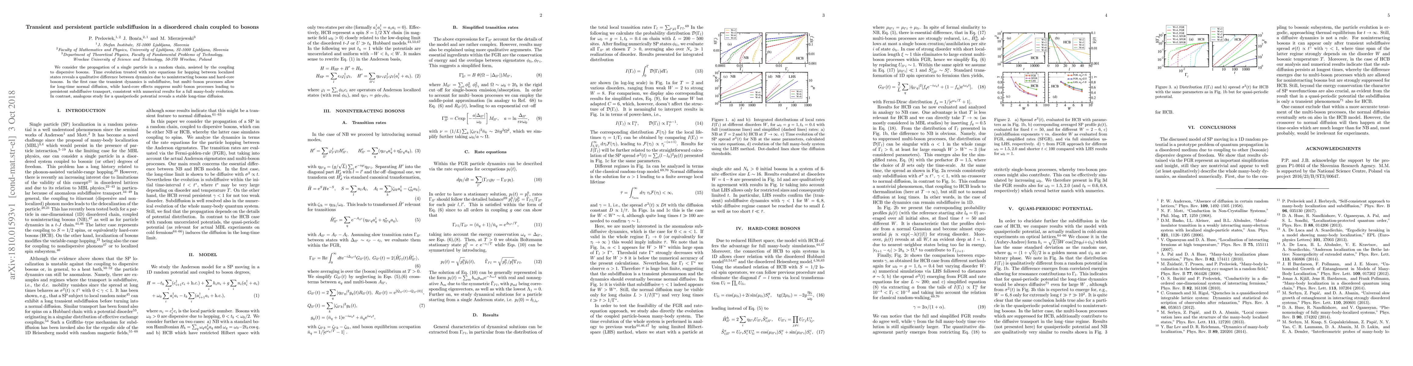 We consider the propagation of a single particle in a random chain, assisted by the coupling to dispersive bosons. Time evolution treated with rate equations for hopping between localized states reveals a qualitative difference between dynamics due to noninteracting bosons and hard-core bosons. In the first case the transient dynamics is subdiffusive, but multi-boson processes allow for long-time normal diffusion, while hard-core effects suppress multi-boson processes leading to persistent subdiffusive transport, consistent with numerical results for a full many-body evolution. In contrast, analogous study for a quasiperiodic potential reveals a stable long-time diffusion.