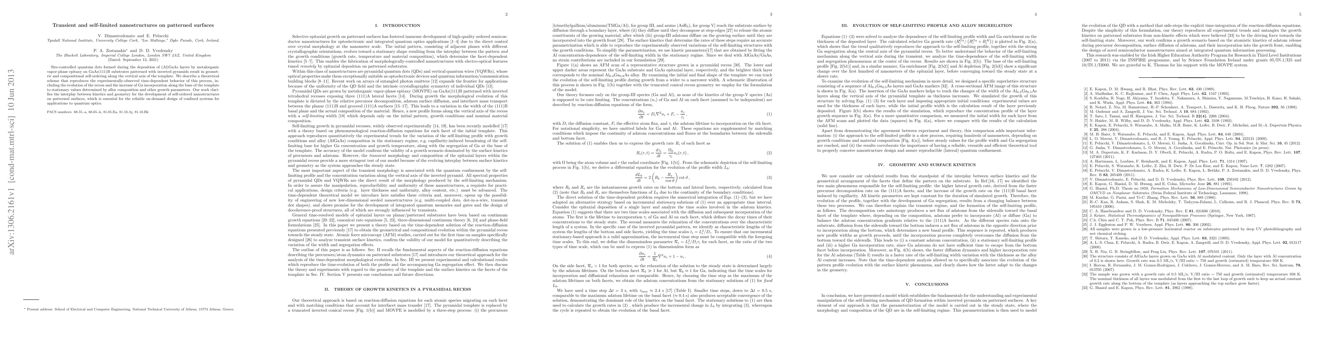Site-controlled quantum dots formed during the deposition of (Al)GaAs layers by metalorganic vapor-phase epitaxy on GaAs(111)B substrates patterned with inverted pyramids result in geometric and compositional self-ordering along the vertical axis of the template. We describe a theoretical scheme that reproduces the experimentally-observed time-dependent behavior of this process, including the evolution of the recess and the increase of Ga incorporation along the base of the template to stationary values determined by alloy composition and other growth parameters. Our work clarifies the interplay between kinetics and geometry for the development of self-ordered nanostructures on patterned surfaces, which is essential for the reliable on-demand design of confined systems for applications to quantum optics.