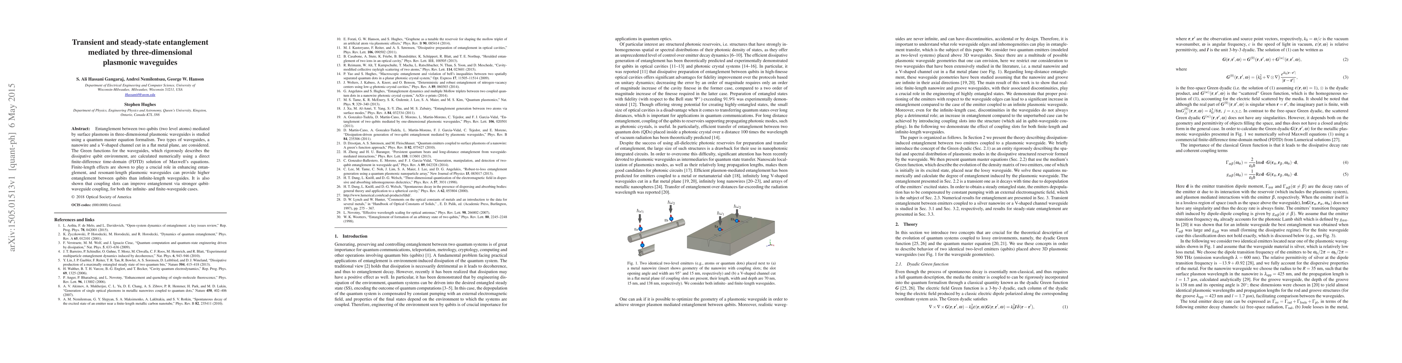 This paper investigates entanglement between qubits mediated by surface plasmons in three-dimensional plasmonic waveguides, finding that finite-length waveguides and coupling slots enhance entanglement compared to infinite-length waveguides. The study uses numerical methods to calculate the waveguide's Green functions and employs a quantum master equation to model the system.