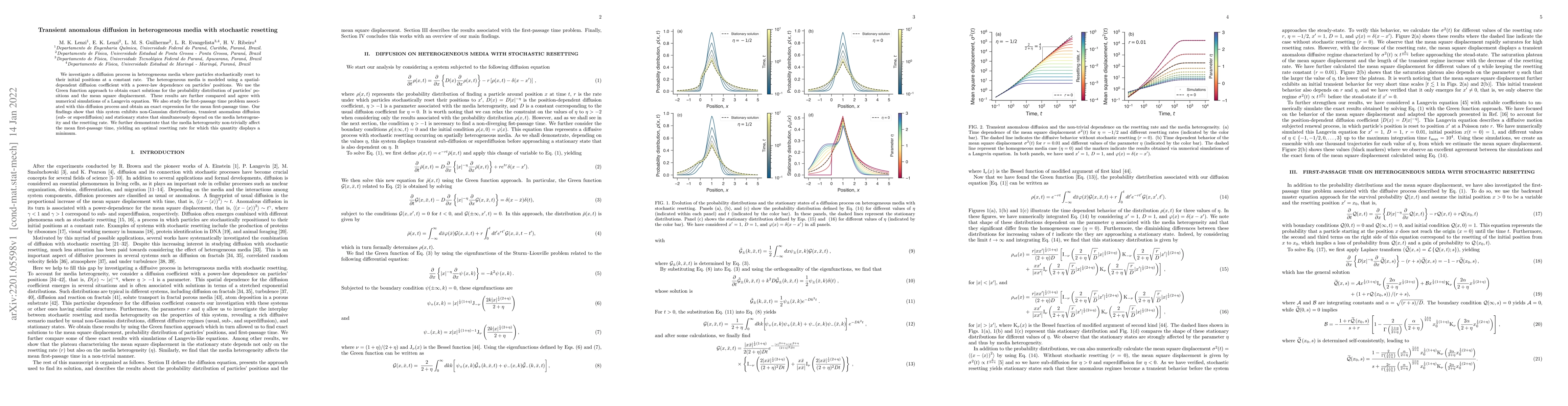 This paper studies diffusion in heterogeneous media with stochastic resetting, revealing transient anomalous diffusion and non-Gaussian distributions. The authors derive exact solutions for the probability distribution and mean first-passage time, showing that media heterogeneity and resetting rate jointly influence diffusion behavior.