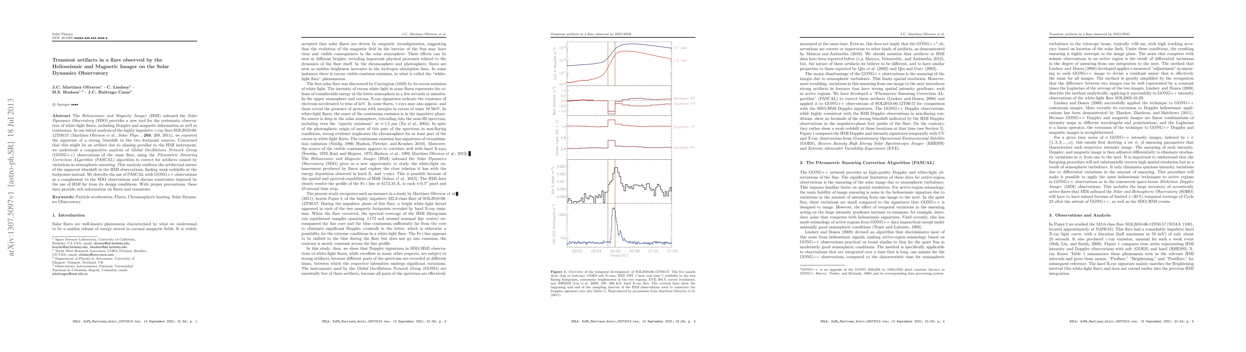The Helioseismic and Magnetic Imager (HMI) onboard the Solar Dynamics Observatory (SDO) provides a new tool for the systematic observation of white-light flares, including Doppler and magnetic information as well as continuum. In our initial analysis of the highly impulsive \gamma-ray flare SOL2010-06-12T00:57 (Mart'{\i}nez Oliveros et al., Solar Phys., 269, 269, 2011), we reported the signature of a strong blueshift in the two footpoint sources. Concerned that this might be an artifact due to aliasing peculiar to the HMI instrument, we undertook a comparative analysis of Global Oscillations Network Group (GONG++) observations of the same flare, using the PArametric Smearing Correction ALgorithm (PASCAL) algorithm to correct for artifacts caused by variations in atmospheric smearing. This analysis confirms the artifactual nature of the apparent blueshift in the HMI observations, finding weak redshifts at the footpoints instead. We describe the use of PASCAL with GONG++ observations as a complement to the SDO observations and discuss constraints imposed by the use of HMI far from its design conditions. With proper precautions, these data provide rich information on flares and transients.