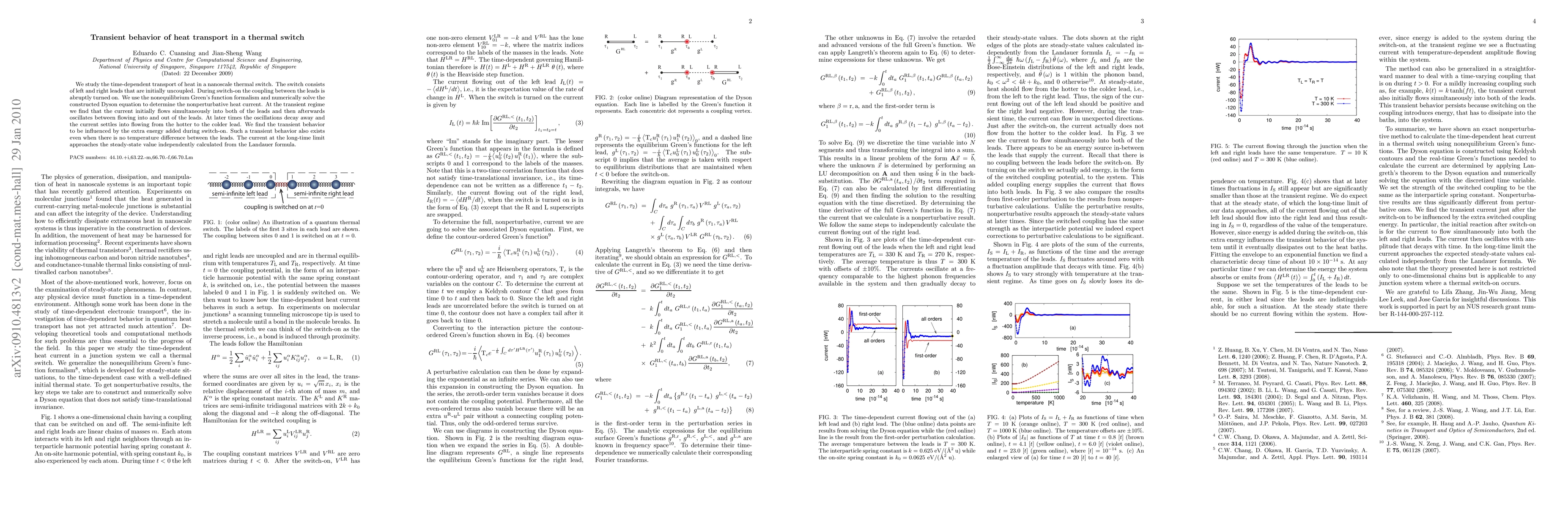 We study the time-dependent transport of heat in a nanoscale thermal switch. The switch consists of left and right leads that are initially uncoupled. During switch-on the coupling between the leads is abruptly turned on. We use the nonequilibrium Green's function formalism and numerically solve the constructed Dyson equation to determine the nonperturbative heat current. At the transient regime we find that the current initially flows simultaneously into both of the leads and then afterwards oscillates between flowing into and out of the leads. At later times the oscillations decay away and the current settles into flowing from the hotter to the colder lead. We find the transient behavior to be influenced by the extra energy added during switch-on. Such a transient behavior also exists even when there is no temperature difference between the leads. The current at the long-time limit approaches the steady-state value independently calculated from the Landauer formula.