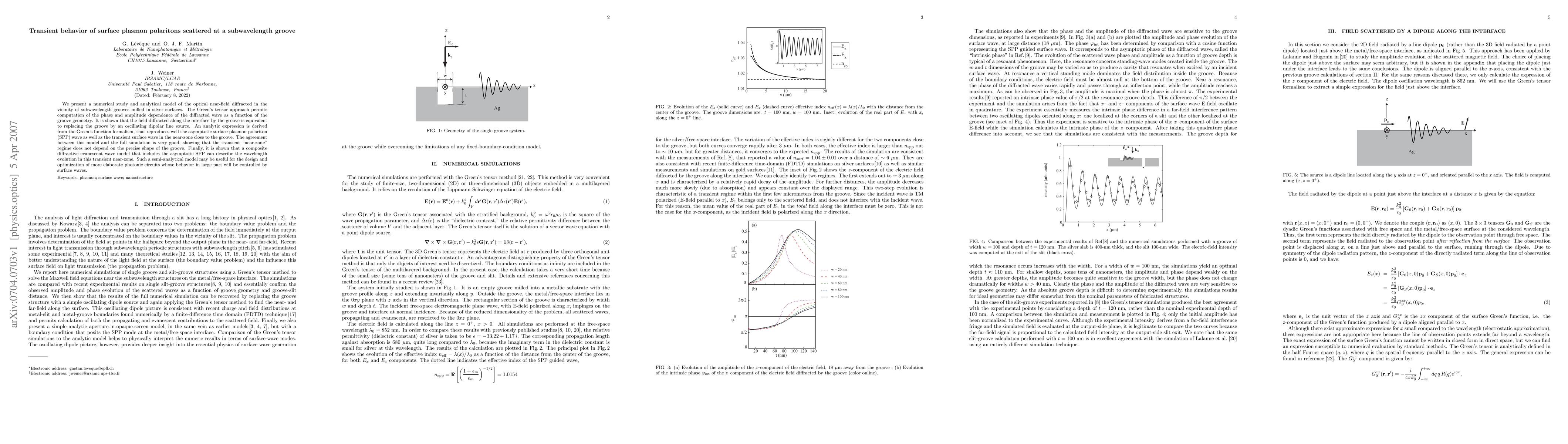 This paper investigates the transient behavior of surface plasmon polaritons scattered by subwavelength grooves in silver surfaces using a Green's tensor approach. The study finds that the diffracted optical near-field can be modeled as an oscillating dipolar line source, and a semi-analytical model accurately describes the transient "near-zone" regime, which is independent of groove shape, potentially aiding in the design of advanced photonic circuits.