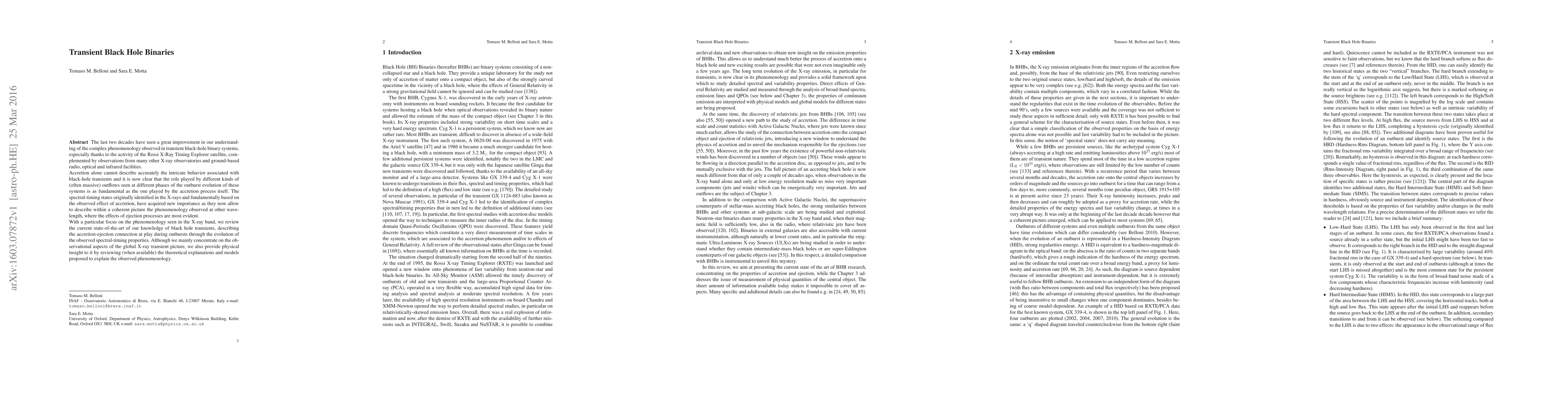 The last two decades have seen a great improvement in our understand- ing of the complex phenomenology observed in transient black-hole binary systems, especially thanks to the activity of the Rossi X-Ray Timing Explorer satellite, com- plemented by observations from many other X-ray observatories and ground-based radio, optical and infrared facilities. Accretion alone cannot describe accurately the intricate behavior associated with black-hole transients and it is now clear that the role played by different kinds of (often massive) outflows seen at different phases of the outburst evolution of these systems is as fundamental as the one played by the accretion process itself. The spectral-timing states originally identified in the X-rays and fundamentally based on the observed effect of accretion, have acquired new importance as they now allow to describe within a coherent picture the phenomenology observed at other wave- length, where the effects of ejection processes are most evident. With a particular focus on the phenomenology seen in the X-ray band, we review the current state-of-the-art of our knowledge of black hole transients, describing the accretion-ejection connection at play during outbursts through the evolution of the observed spectral-timing properties. Although we mainly concentrate on the ob- servational aspects of the global X-ray transient picture, we also provide physical insight to it by reviewing (when available) the theoretical explanations and models proposed to explain the observed phenomenology.