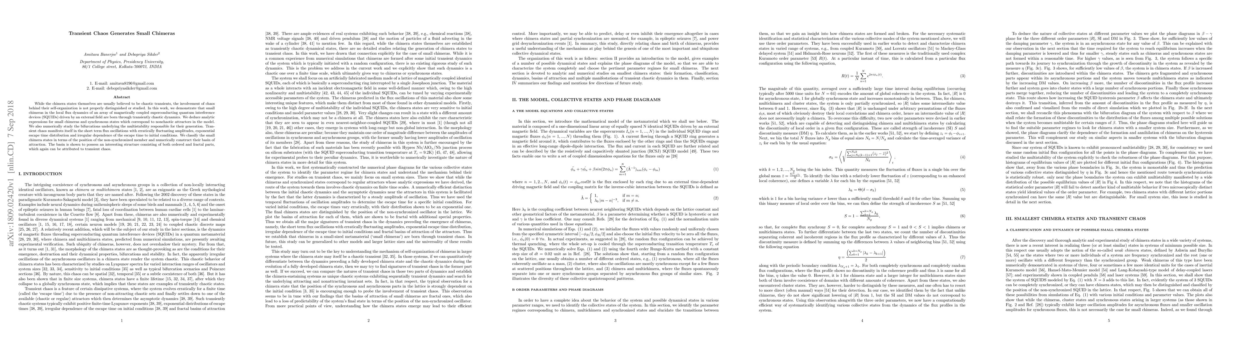 While the chimera states themselves are usually believed to be chaotic transients, the involvement of chaos behind their self-organization is not properly distinguished or studied. In this work, we demonstrate that small chimeras in the local flux dynamics of an array of magnetically coupled superconducting quantum interference devices (SQUIDs) driven by an external field are born through transiently chaotic dynamics. We deduce analytic expressions for small chimeras and synchronous states which correspond to nonchaotic attractors in the model. We also numerically study the bifurcations underlying the multistability responsible for their generation. Transient chaos manifests itself in the short term flux oscillations with erratically fluctuating amplitudes, exponential escape time distribution and irregular dependence of the escape time to initial conditions. We classify the small chimera states in terms of the position of the non-synchronized member and numerically construct their basin of attraction. The basin is shown to possess an interesting structure consisting of both ordered and fractal parts, which again can be attributed to transient chaos.
