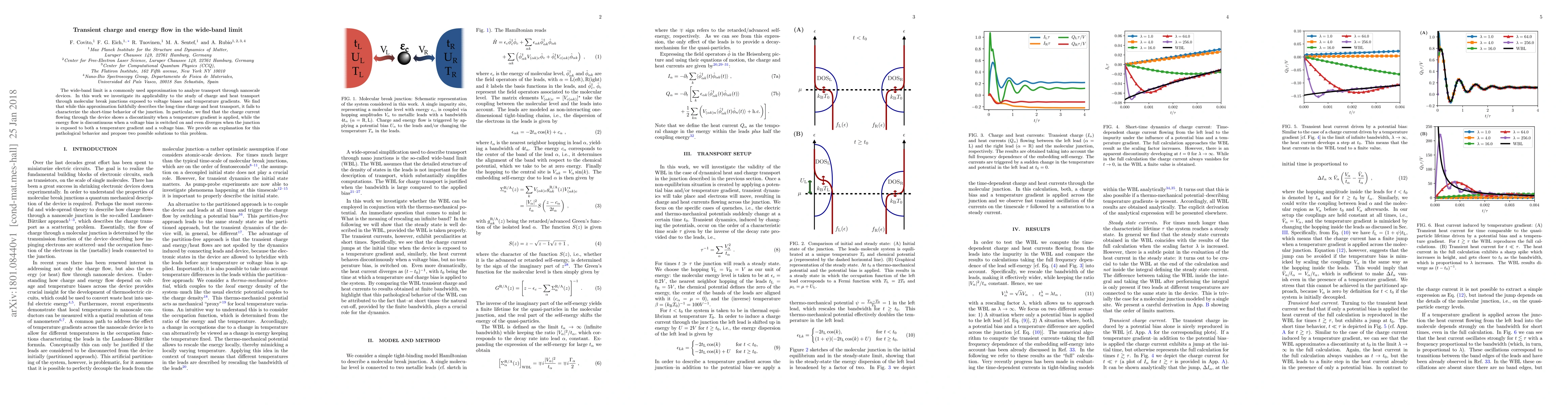 The wide-band limit is a commonly used approximation to analyze transport through nanoscale devices. In this work we investigate its applicability to the study of charge and heat transport through molecular break junctions exposed to voltage biases and temperature gradients. We find that while this approximation faithfully describes the long-time charge and heat transport, it fails to characterize the short-time behavior of the junction. In particular, we find that the charge current flowing through the device shows a discontinuity when a temperature gradient is applied, while the energy flow is discontinuous when a voltage bias is switched on and even diverges when the junction is exposed to both a temperature gradient and a voltage bias. We provide an explanation for this pathological behavior and propose two possible solutions to this problem.