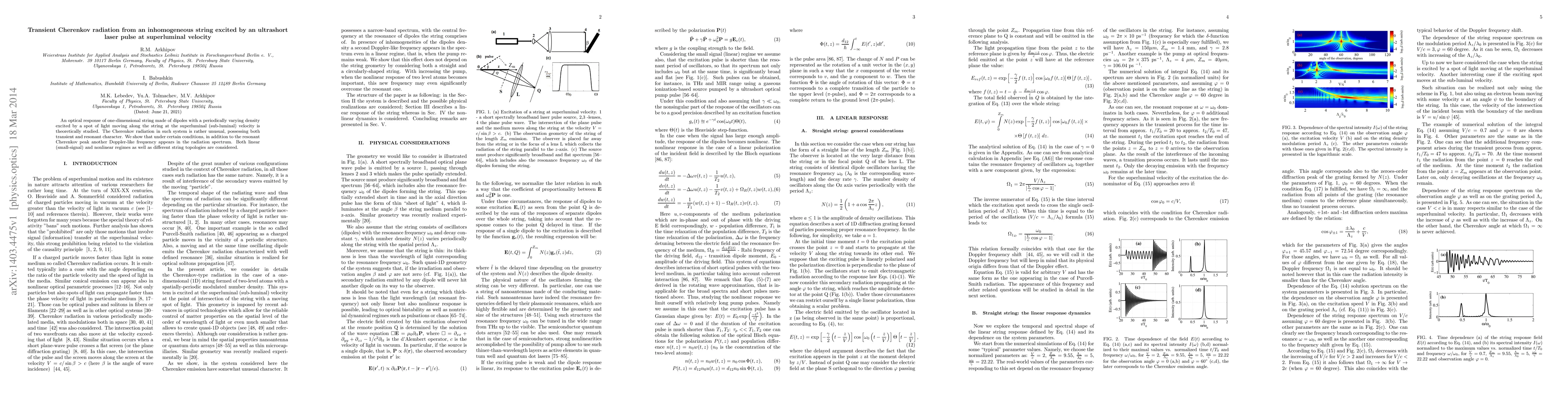 This paper investigates the optical response of a dipole string with varying density excited by an ultrashort laser pulse traveling at superluminal or subluminal velocities. The study reveals unusual transient and resonant Cherenkov radiation, including a Doppler-like frequency peak in addition to the resonant peak, under specific conditions, across linear and nonlinear regimes and various string configurations.