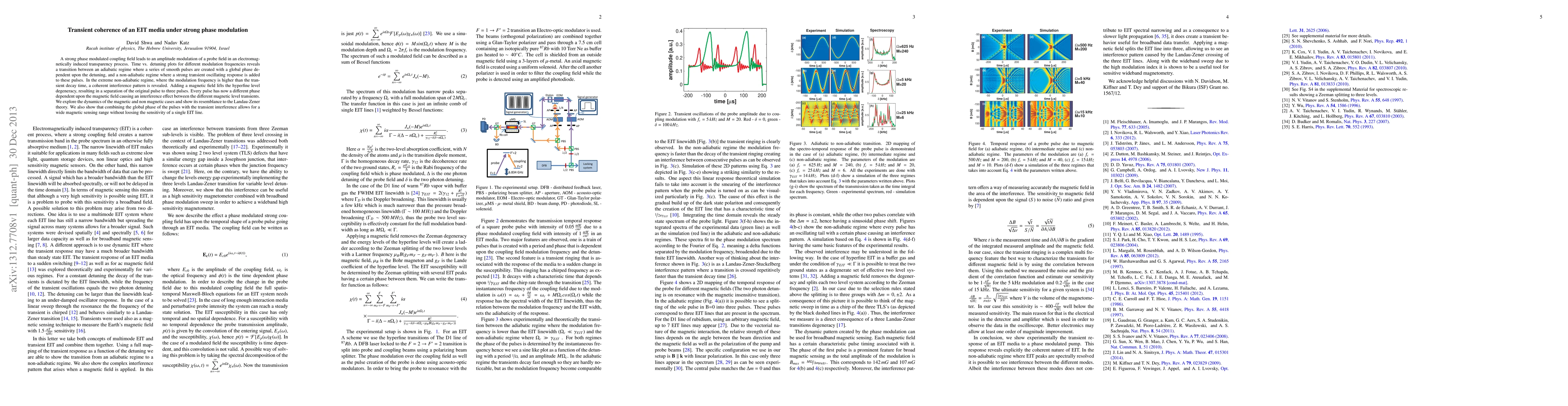 A strong phase modulated coupling field leads to an amplitude modulation of a probe field in an electromagnetically induced transparency process. Time vs. detuning plots for different modulation frequencies reveals a transition between an adiabatic regime where a series of smooth pulses are created with a global phase dependent upon the detuning, and a non-adiabatic regime where a strong transient oscillating response is added to these pulses. In the extreme non-adiabatic regime, where the modulation frequency is higher than the transient decay time, a coherent interference pattern is revealed. Adding a magnetic field lifts the hyperfine level degeneracy, resulting in a separation of the original pulse to three pulses. Every pulse has now a different phase dependent upon the magnetic field causing an interference effect between the different magnetic level transients. We explore the dynamics of the magnetic and non magnetic cases and show its resemblance to the Landau-Zener theory. We also show that combining the global phase of the pulses with the transient interference allows for a wide magnetic sensing range without loosing the sensitivity of a single EIT line.