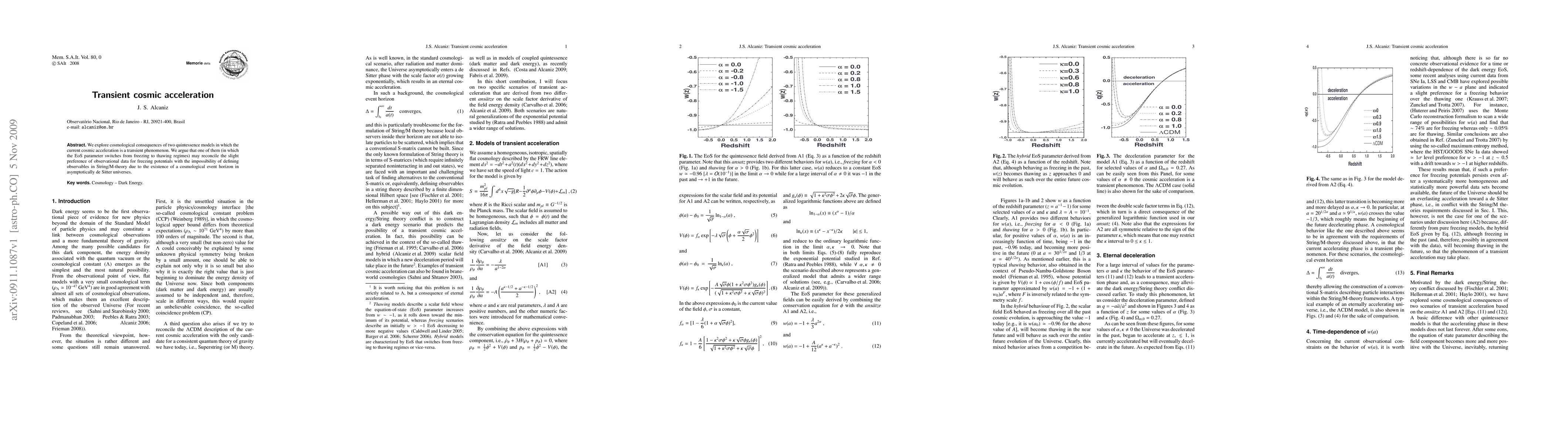 We explore cosmological consequences of two quintessence models in which the current cosmic acceleration is a transient phenomenon. We argue that one of them (in which the EoS parameter switches from freezing to thawing regimes) may reconcile the slight preference of observational data for freezing potentials with the impossibility of defining observables in String/M-theory due to the existence of a cosmological event horizon in asymptotically de Sitter universes.