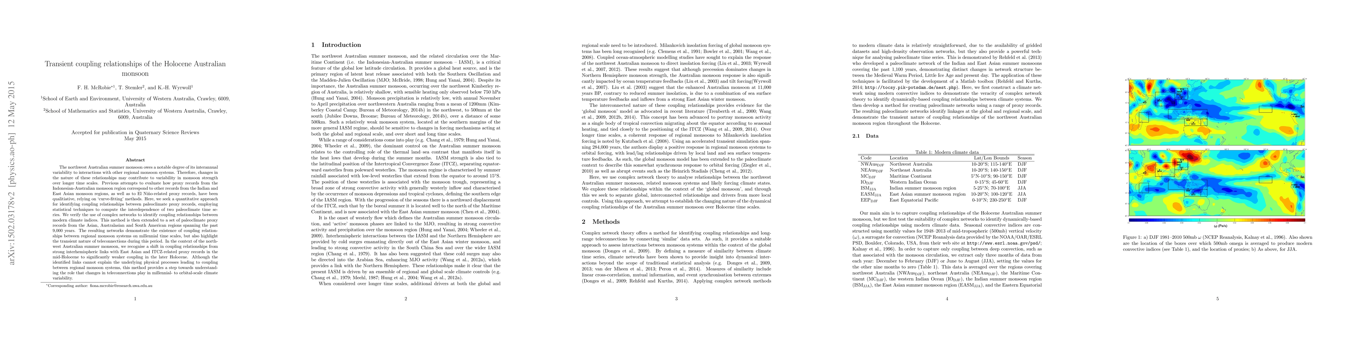 The northwest Australian summer monsoon owes a notable degree of its interannual variability to interactions with other regional monsoon systems. Therefore, changes in the nature of these relationships may contribute to variability in monsoon strength over longer time scales. Previous attempts to evaluate how proxy records from the Indonesian-Australian monsoon region correspond to other records from the Indian and East Asian monsoon regions, as well as to El Ni\~no-related proxy records, have been qualitiative, relying on `curve-fitting' methods. Here, we seek a quantitative approach for identifying coupling relationships between paleoclimate proxy records, employing statistical techniques to compute the interdependence of two paleoclimate time series. We verify the use of complex networks to identify coupling relationships between modern climate indices. This method is then extended to a set of paleoclimate proxy records from the Asian, Australasian and South American regions spanning the past 9,000 years. The resulting networks demonstrate the existence of coupling relationships between regional monsoon systems on millennial time scales, but also highlight the transient nature of teleconnections during this period. In the context of the northwest Australian summer monsoon, we recognise a shift in coupling relationships from strong interhemispheric links with East Asian and ITCZ-related proxy records in the mid-Holocene to significantly weaker coupling in the later Holocene. Although the identified links cannot explain the underlying physical processes leading to coupling between regional monsoon systems, this method provides a step towards understanding the role that changes in teleconnections play in millennial- to orbital-scale climate variability.