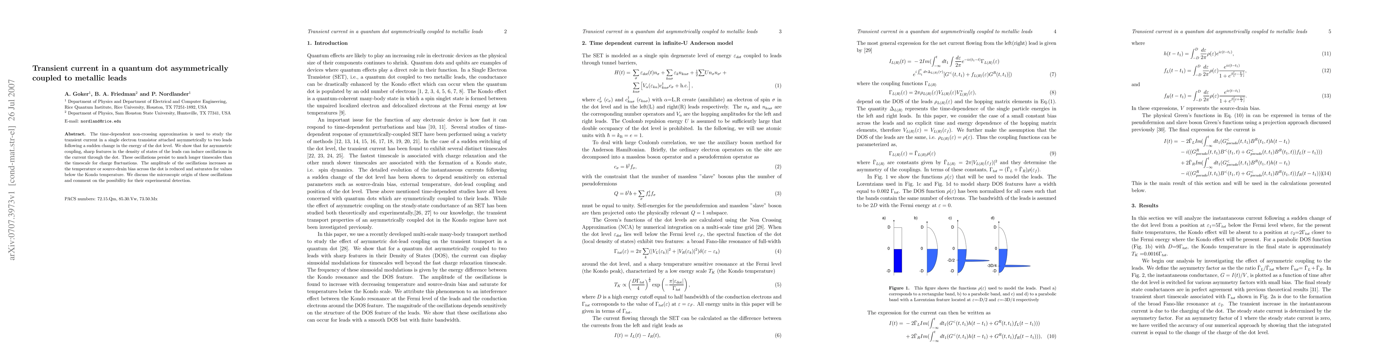 This study uses the time-dependent non-crossing approximation to analyze transient current in a single electron transistor with asymmetric coupling to metallic leads. It reveals that sharp features in the leads' density of states can induce persistent oscillations in the current, whose amplitude increases with lower temperature or bias and saturates below the Kondo temperature.
