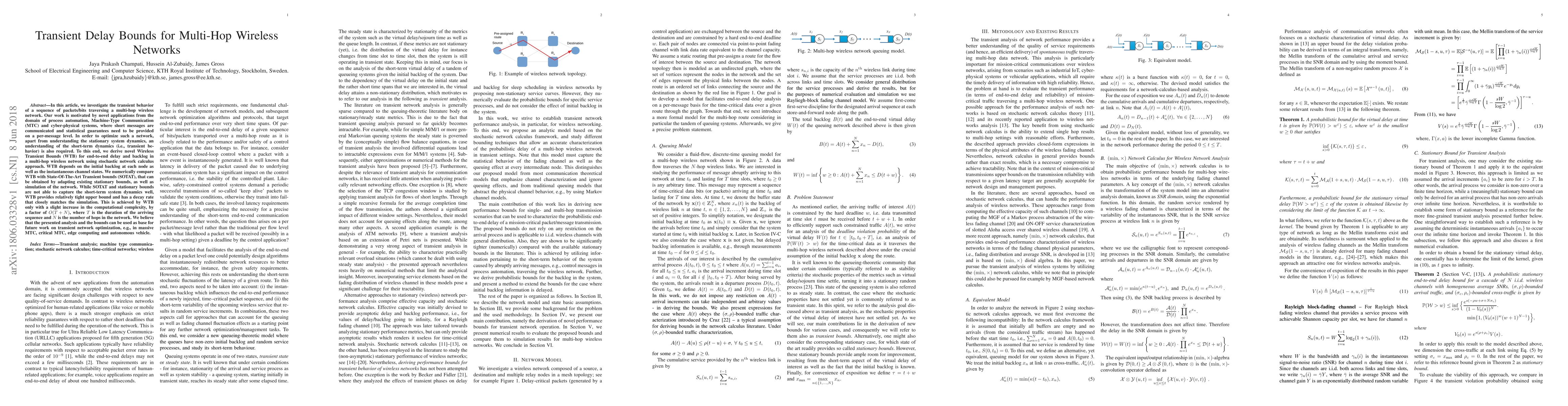 In this article, we investigate the transient behavior of a sequence of packets/bits traversing a multi-hop wireless network. Our work is motivated by novel applications from the domain of process automation, Machine-Type Communication (MTC) and cyber-physical systems, where short messages are communicated and statistical guarantees need to be provided on a per-message level. In order to optimize such a network, apart from understanding the stationary system dynamics, an understanding of the short-term dynamics (i.e., transient behavior) is also required. To this end, we derive novel Wireless Transient Bounds (WTB) for end-to-end delay and backlog in a multi-hop wireless network using stochastic network calculus approach. WTB depends on the initial backlog at each node as well as the instantaneous channel states. We numerically compare WTB with State-Of-The-Art Transient bounds (SOTAT), that can be obtained by adapting existing stationary bounds, as well as simulation of the network. While SOTAT and stationary bounds are not able to capture the short-term system dynamics well, WTB provides relatively tight upper bound and has a decay rate that closely matches the simulation. This is achieved by WTB only with a slight increase in the computational complexity, by a factor of O(T + N), where T is the duration of the arriving sequence and N is the number of hops in the network. We believe that the presented analysis and the bounds can be used as base for future work on transient network optimization, e.g., in massive MTC, critical MTC, edge computing and autonomous vehicle.