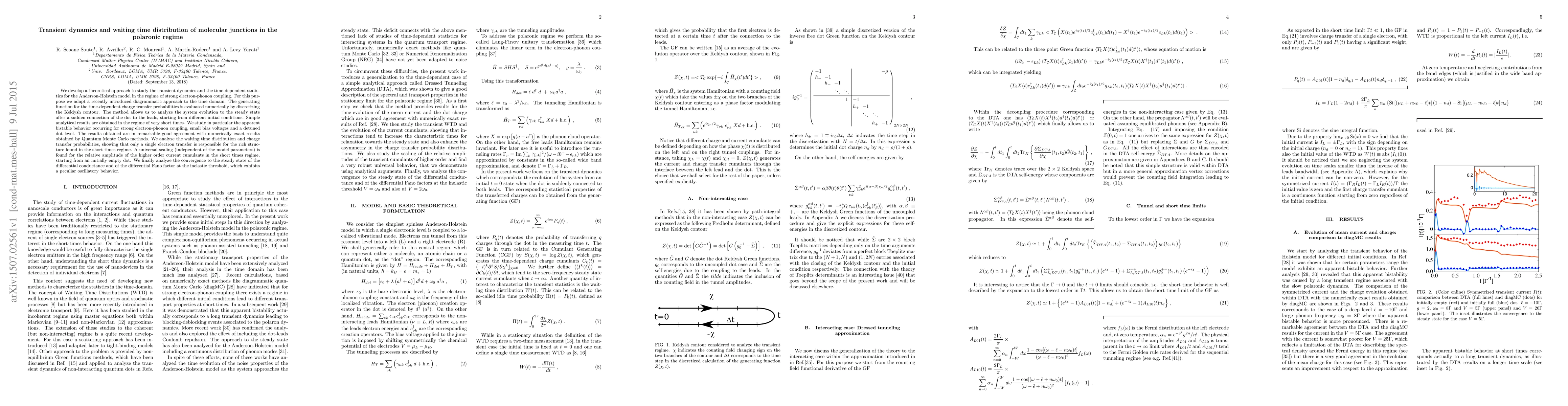 This paper explores the transient dynamics and waiting time distribution of molecular junctions in the polaronic regime using a diagrammatic approach. It reveals a bistable behavior under strong electron-phonon coupling and small bias voltages, with a universal scaling for higher-order current cumulants, and shows oscillatory convergence to the steady state.