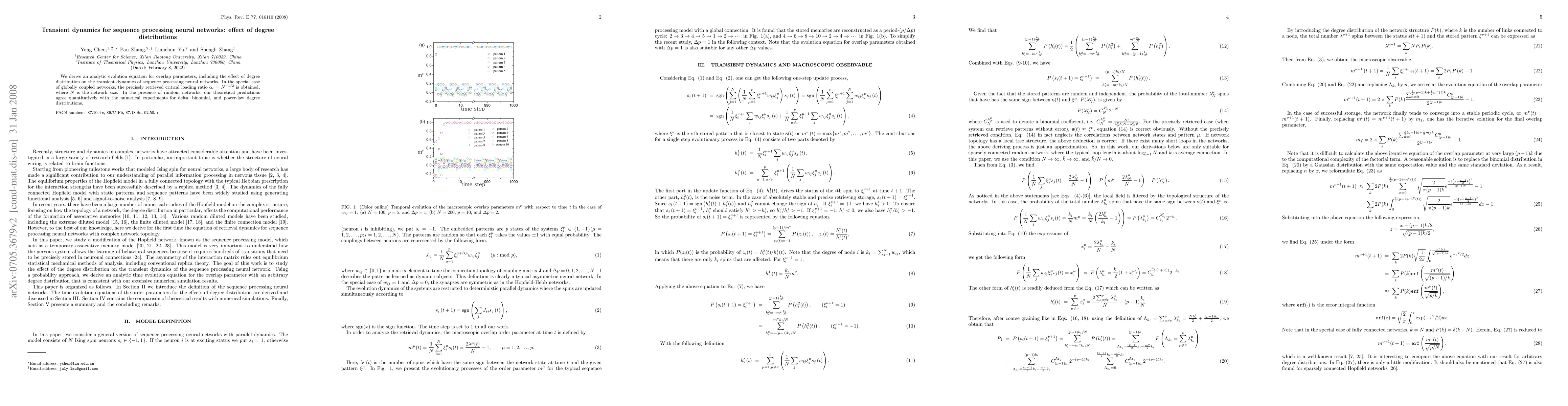 We derive a analytic evolution equation for overlap parameters including the effect of degree distribution on the transient dynamics of sequence processing neural networks. In the special case of globally coupled networks, the precisely retrieved critical loading ratio $\alpha_c = N ^{-1/2}$ is obtained, where $N$ is the network size. In the presence of random networks, our theoretical predictions agree quantitatively with the numerical experiments for delta, binomial, and power-law degree distributions.